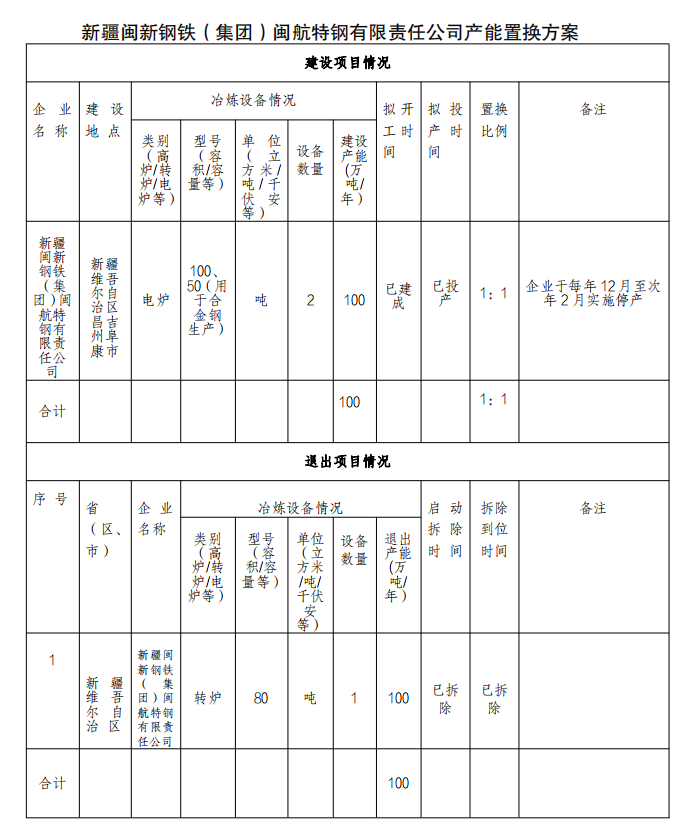 为落实第二轮中央生态环境保护督察第八项整改任务的相关措施,按照《国务院关于化解产能严重过剩矛盾的指导意见》《国务院关于钢铁行业化解过剩产能实现脱困发展的意见》和《钢铁行业产能置换实施办法》要求,我厅拟对2018年已公告的新疆闽新钢铁(集团)闽航特钢有限责任公司建设项目产能置换方案予以更正。现将拟更正的新疆闽新钢铁(集团)闽航特钢有限责任公司建设项目产能置换方案予以公示,欢迎社会公众进行监督。公示期为2023年10月23日-11月17日,如有异议,请以书面形式向我厅反映情况。