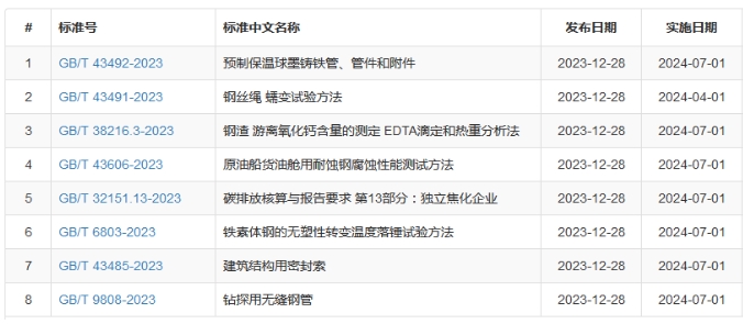 近日,国家市场监督管理总局(国家标准化管理委员会)批准发布423项推荐性国家标准,其中钢铁领域国家标准8项,通知及具体标准如下: