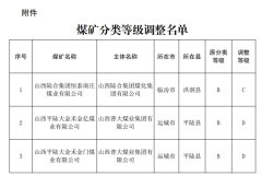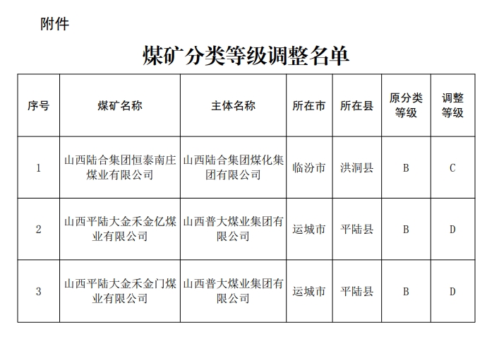 2024年8月份接到临汾、运城两市3座煤矿关于调整煤矿分类等级的报告,按照《山西省人民政府办公厅关于印发山西省煤矿分级分类安全监管监察办法的通知》(晋政办发〔2020〕22 号)第九条第二款和有关分类标准规定,经审核,同意山西陆合集团恒泰南庄煤业有限公司由B 类调整为C 类,山西平陆大金禾金亿煤业有限公司、山西平陆大金禾金门煤业有限公司等2座煤矿由 B 类调整为 D 类。现将调整后煤矿分类名单进行公告,各级煤矿安全监管监察部门按照调整后的类别实施监管监察工作。其他煤矿分类等级仍按《山西省安全生产委员会办公室关于公布 2024 年度煤矿分类名单的通知》(晋安办发〔2024〕7号)执行。