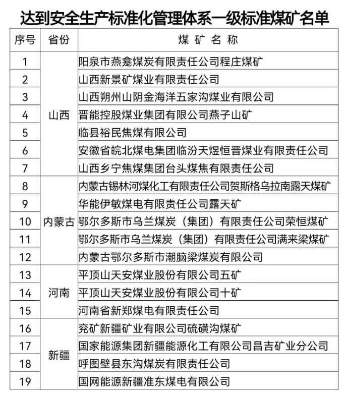 按照《煤矿安全生产标准化管理体系考核定级办法》和《煤矿安全生产标准化管理体系基本要求及评分方法》(矿安〔2024〕109号)的有关规定,经现场检查和抽查,有19处煤矿达到安全生产标准化管理体系一级标准,现予以公示,接受社会监督。公示期间,如发现申报煤矿存在瞒报事故、弄虚作假等违法违规行为的,将依规定取消其申报资格。