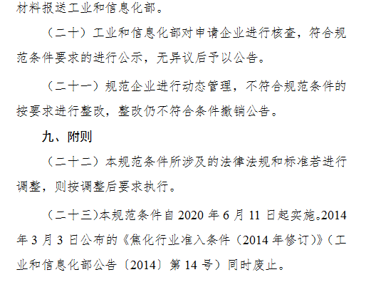 为进一步加快焦化行业转型升级,促进焦化行业技术进步,提升资源综合利用率和节能环保水平,推动焦化行业高质量发展,根据国家有关法律法规和产业政策,制定《焦化行业规范条件》,现予以公告。