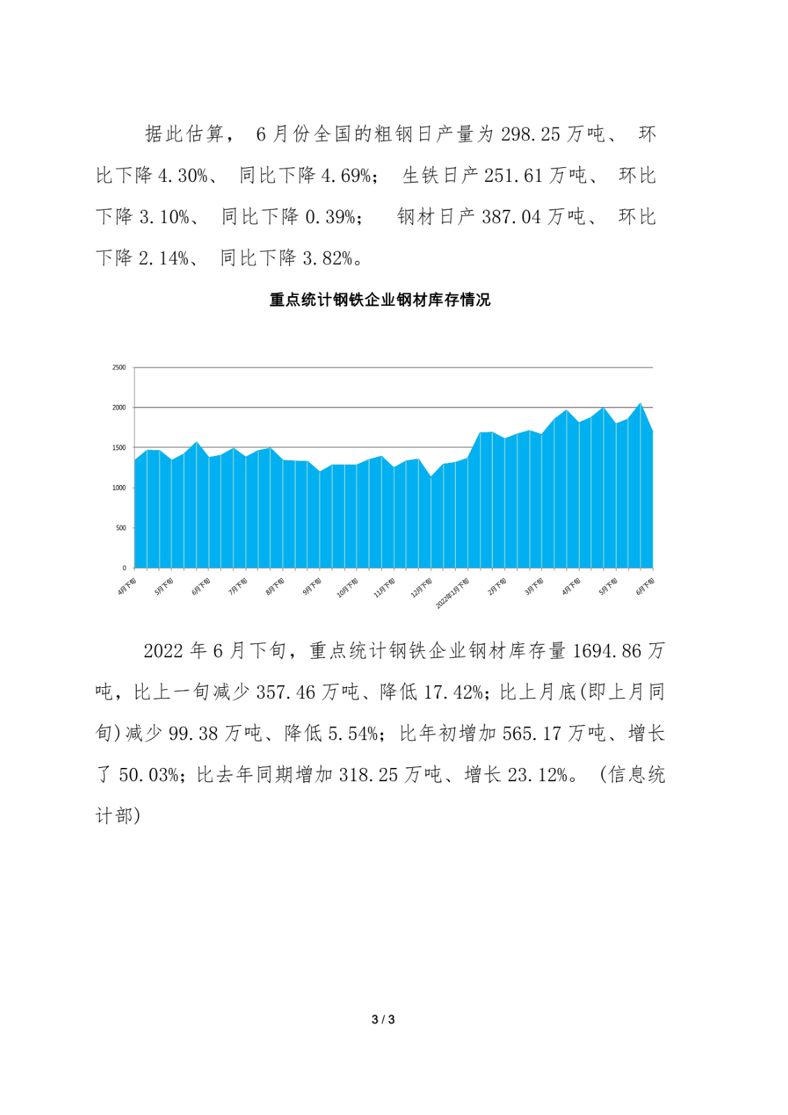 据中钢协数据显示,2022年6月下旬,重点钢企粗钢日均产量209.91万吨,环比下降7.03%;钢材库存量1694.86万吨,比上一旬(及6月中旬)减少357.46万吨,降低17.42%。