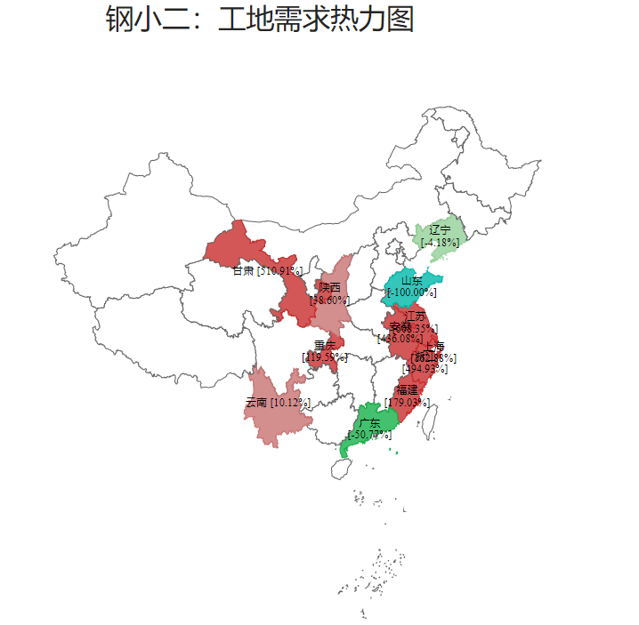 成交方面:昨日全国大部分地区建筑钢材成交表现回暖,其中上海、江苏、安徽、浙江、福建、甘肃等地区成交环比明显上升,而山东、辽宁、广东等地区成交环比仍出现下降。如下图所示: