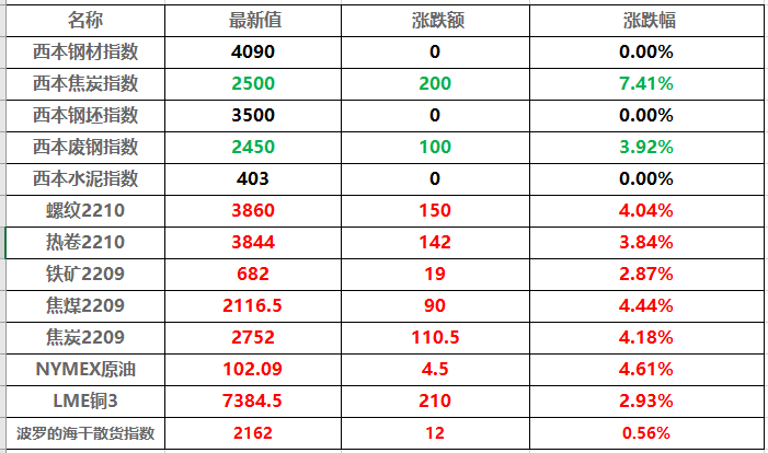 国内期货主力合约几乎全线上涨。燃油涨超6%,沥青、低硫燃料油(LU)、棕榈涨超5%,焦煤、聚氯乙烯(PVC)、螺纹、焦炭涨超4%,热卷涨近4%,塑料、石油气(LPG)涨超3%;跌幅方面,豆一跌超1%。沪镍收涨5.96%,国际铜收涨3.35%,沪铜收涨3.4%,沪铝收涨3.69%,沪锌收涨1.79%,沪铅收涨1.64%,沪锡收涨2.45%。