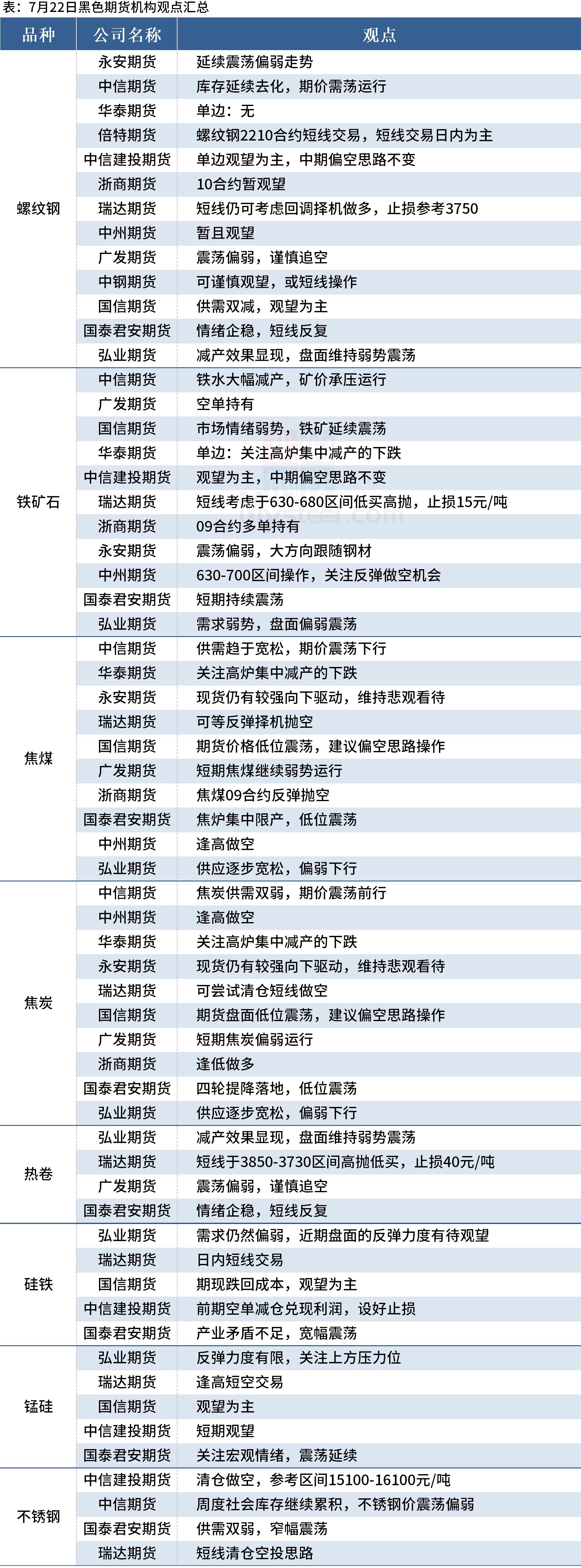 据Mysteel统计7月22日13家期货机构操作策略,其中多数机构预计螺纹钢震荡运行,预计铁矿石偏弱震荡,焦煤、焦炭震荡下行。具体汇总内容如下: