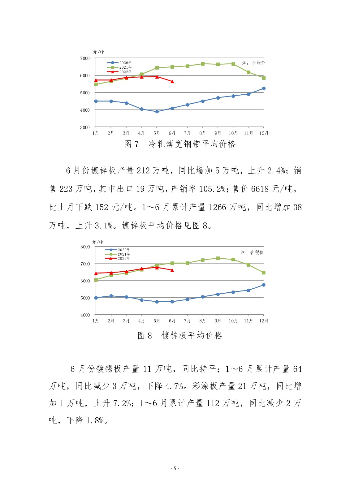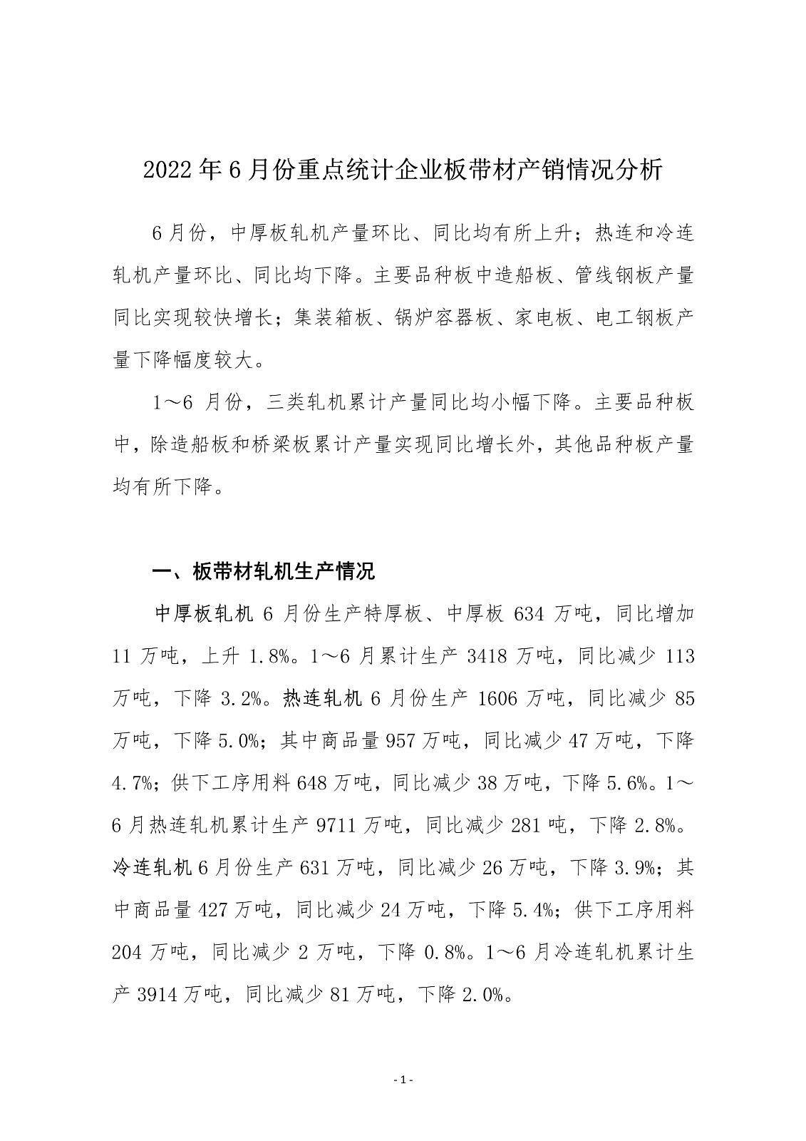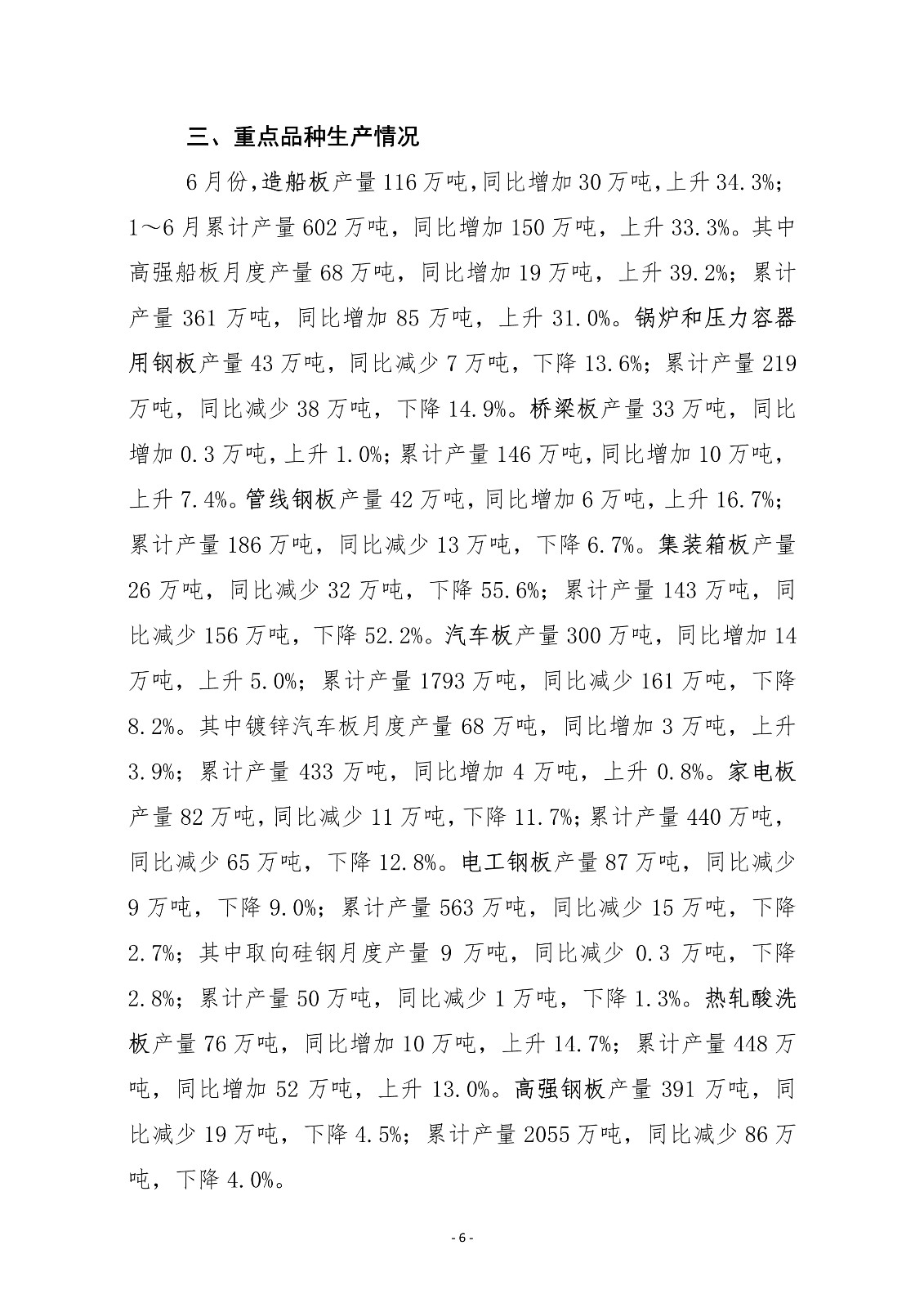 6月份,中厚板轧机产量环比、同比均有所上升;热连和冷连轧机产量环比、同比均下降。主要品种板中造船板、管线钢板产量同比实现较快增长;集装箱板、锅炉容器板、家电板、电工钢板产量下降幅度较大。