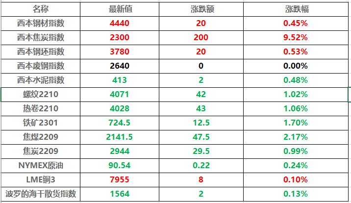黑色系跌幅领先,原油系品种涨幅居前。纯碱、聚氯乙烯(PVC)、20号胶(NR)跌超1%,燃油、沥青涨超2%,低硫燃料油(LU)、玉米涨超1%。螺纹期货夜盘收跌1.02%,热卷收跌1.06%;铁矿石期货收跌1.70%。焦炭夜盘收跌0.99%,焦煤收跌2.17%。国际铜夜盘收涨0.11%,沪铜收涨0.18%,沪铝收涨0.86%,沪锌收涨2.04%,沪铅收跌0.16%,沪镍收涨0.32%,沪锡收涨1.28%。不锈钢夜盘收跌0.80%。