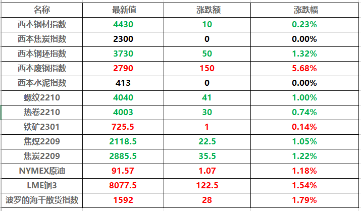 螺纹期货夜盘收跌0.98%,热卷收跌0.74%;铁矿石期货收涨0.14%。焦炭夜盘收跌1.22%,焦煤收跌1.05%。国际铜夜盘收涨0.79%,沪铜收涨0.85%,沪铝收涨0.08%,沪锌收涨1.84%,沪铅收跌0.56%,沪镍收涨3.78%,沪锡收涨0.68%。不锈钢夜盘收涨0.23%。上期所原油期货2209合约夜盘收涨1%,报684.30元人民币/桶。沪金夜盘收跌0.54%,沪银收涨0.13%。