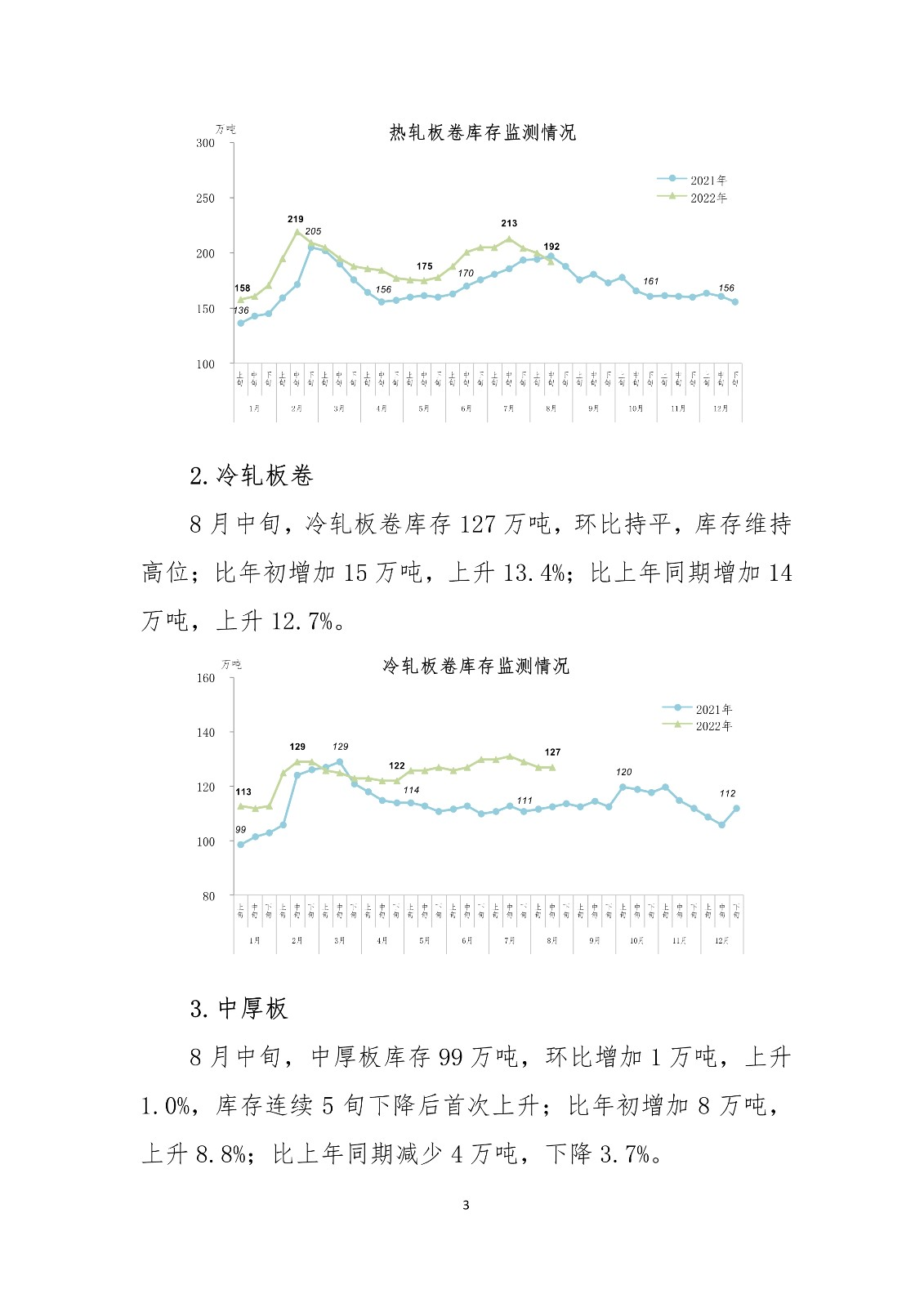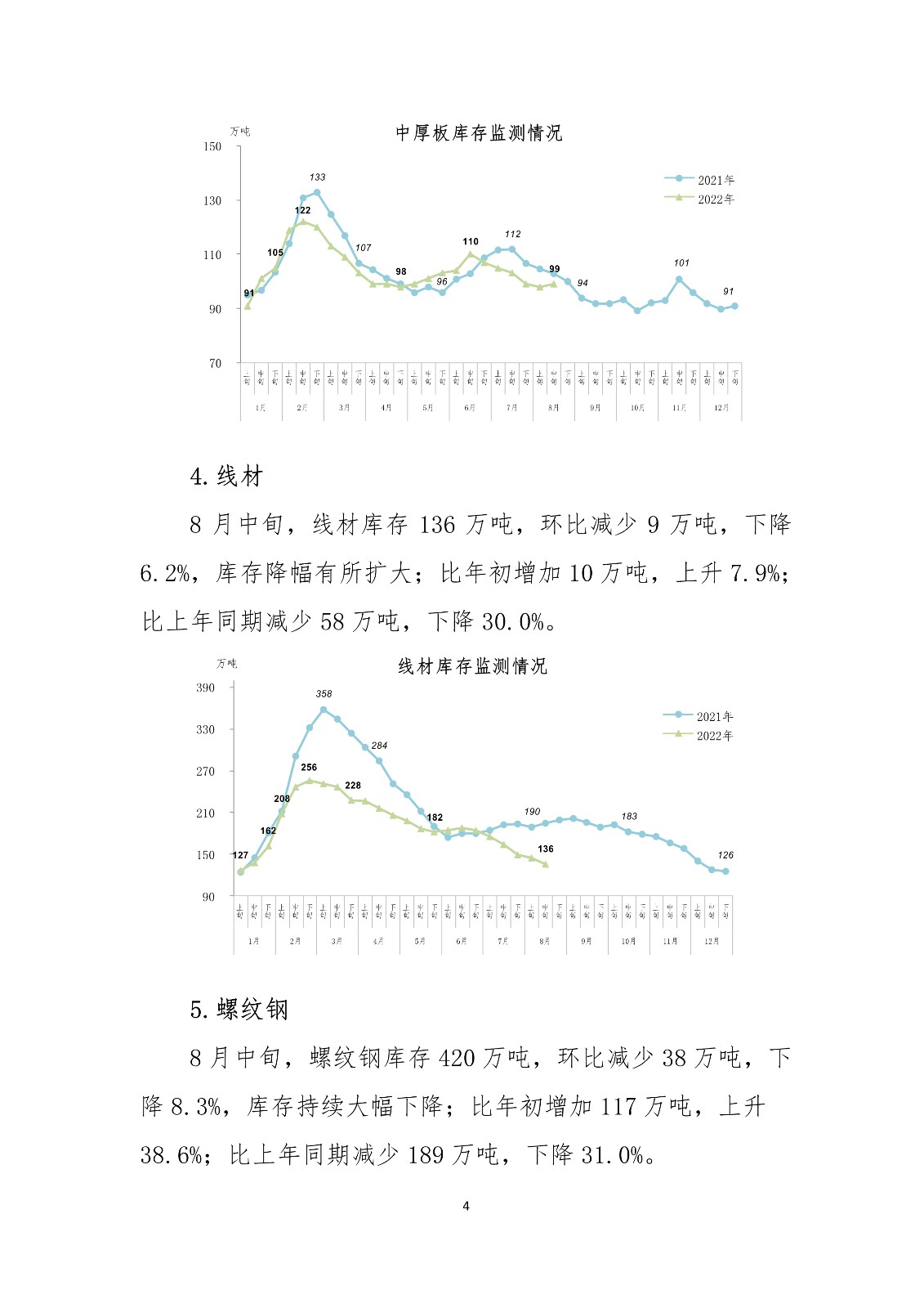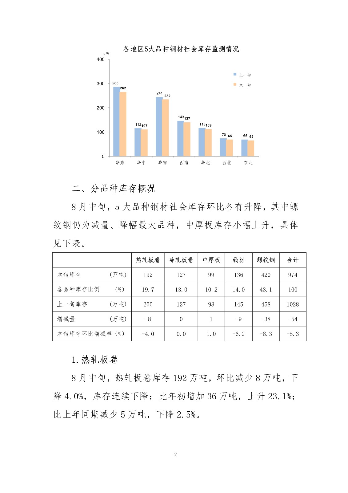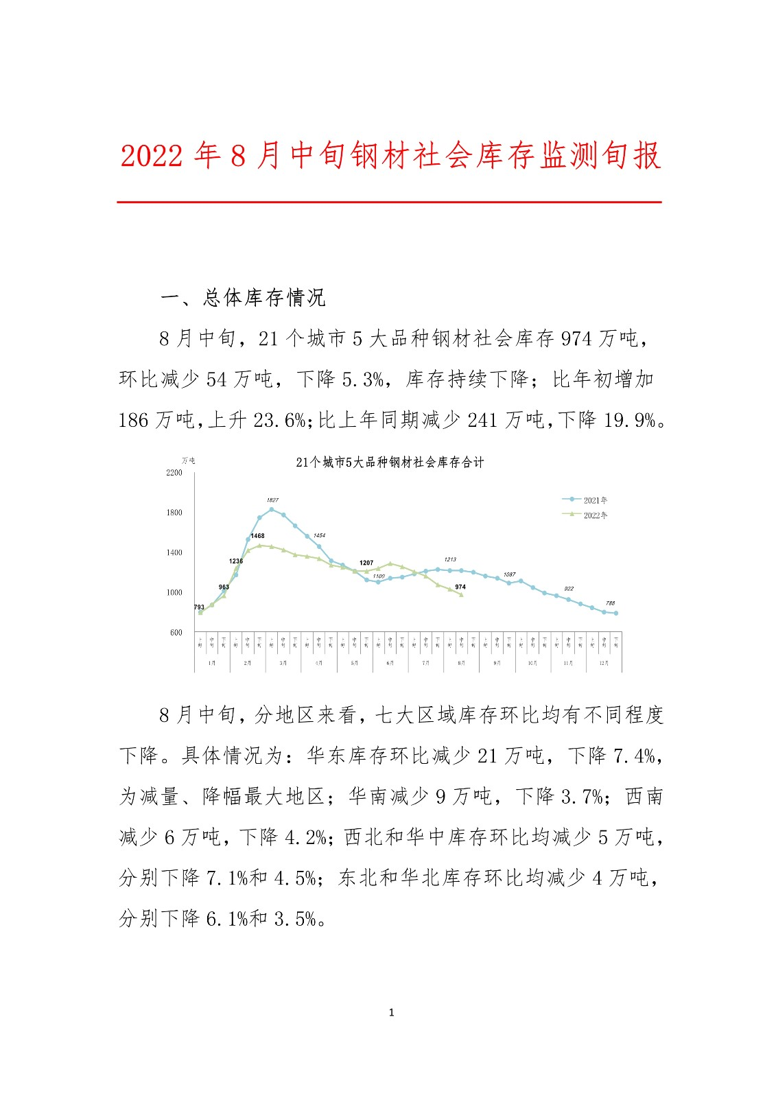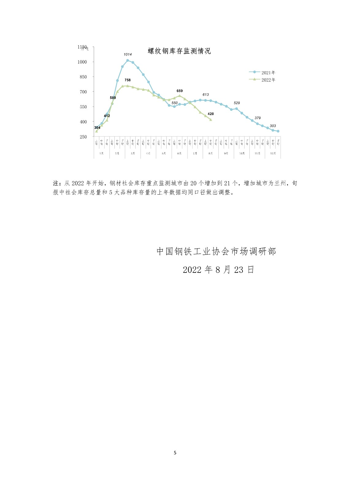 8月中旬,21个城市5大品种钢材社会库存974万吨,环比减少54万吨,下降5.3%,库存持续下降;比年初增加186万吨,上升23.6%;比上年同期减少241万吨,下降19.9%。