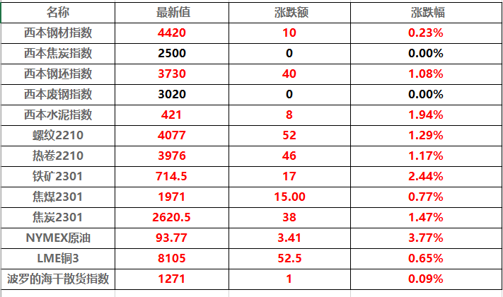 动力煤涨超6%,苯乙烯(EB)、低硫燃料油(LU)、PTA涨超3%,短纤、液化石油气(LPG)、铁矿、棉纱、燃油、菜油涨超2%;跌幅方面,沥青跌超2%,豆一跌超1%。螺纹期货夜盘收涨1.29%,热卷收涨1.17%;铁矿石期货收涨2.44%。焦炭夜盘收涨0.29%,焦煤收涨0.77%。国际铜夜盘收涨0.95%,沪铜收涨0.91%,沪铝收涨1.32%,沪锌收平,沪铅收跌0.13%,沪镍收跌2.31%,沪锡收涨0.12%。不锈钢夜盘收涨0.10%。