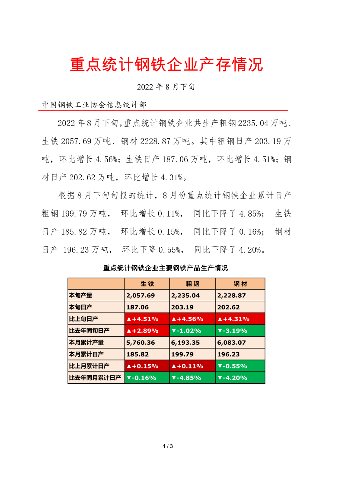 据中钢协数据显示,8月下旬重点钢企粗钢日产203.19万吨,环比增长4.56%;钢材库存量1594.30万吨,比上一旬减少138.62万吨、降低8.00%;比上月底(即上月同旬)减少65.36万吨、降低3.94%。