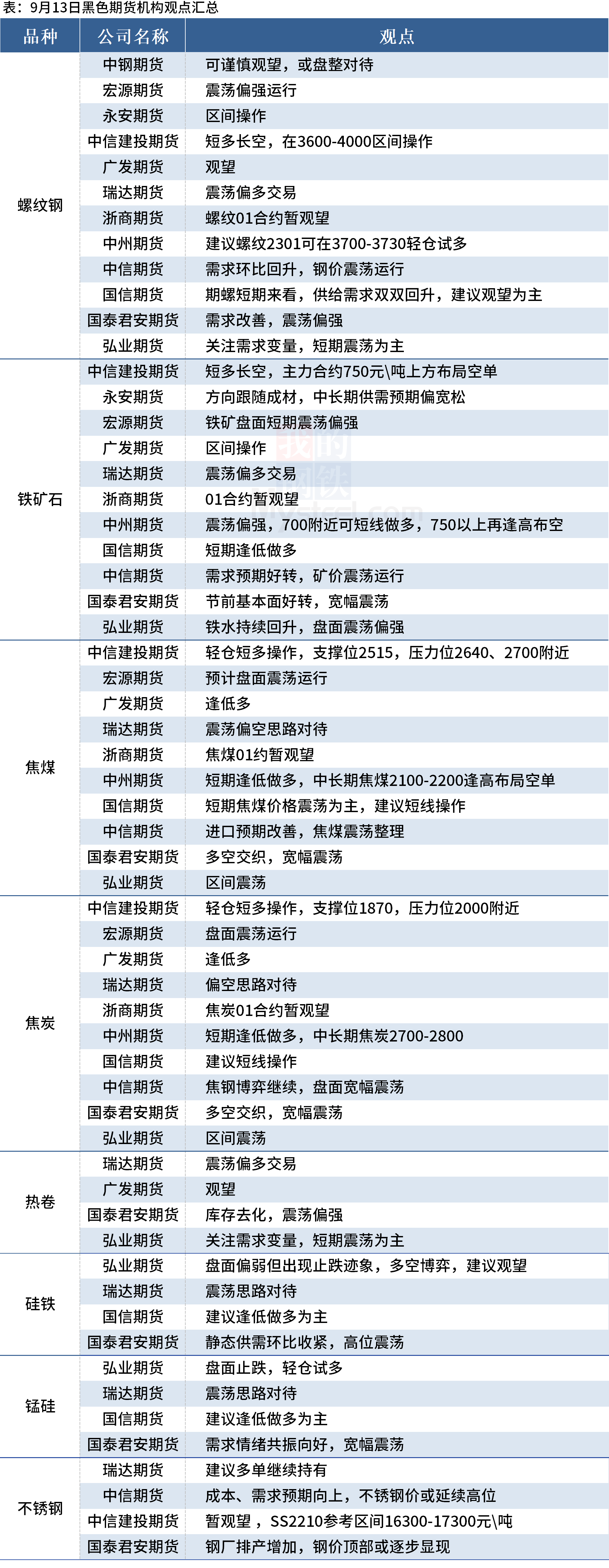据Mysteel统计9月13日12家期货机构操作策略,其中多数机构料螺纹钢震荡偏强,建议铁矿石震荡偏强,焦煤、焦炭震荡运行。具体汇总内容如下:
