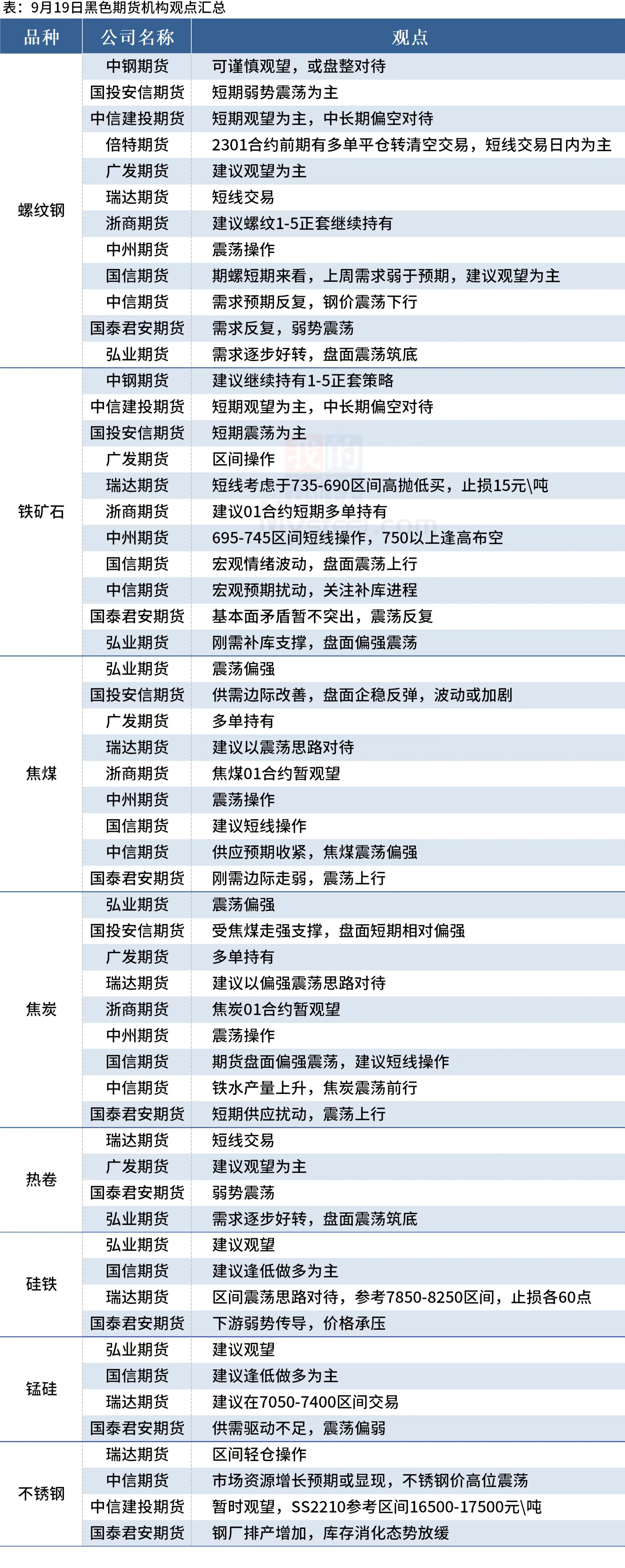 Mysteel统计9月19日12家期货机构操作策略,其中多数机构料螺纹钢震荡运行,建议铁矿石震荡运行,焦煤、焦炭震荡运行。具体汇总内容如下: