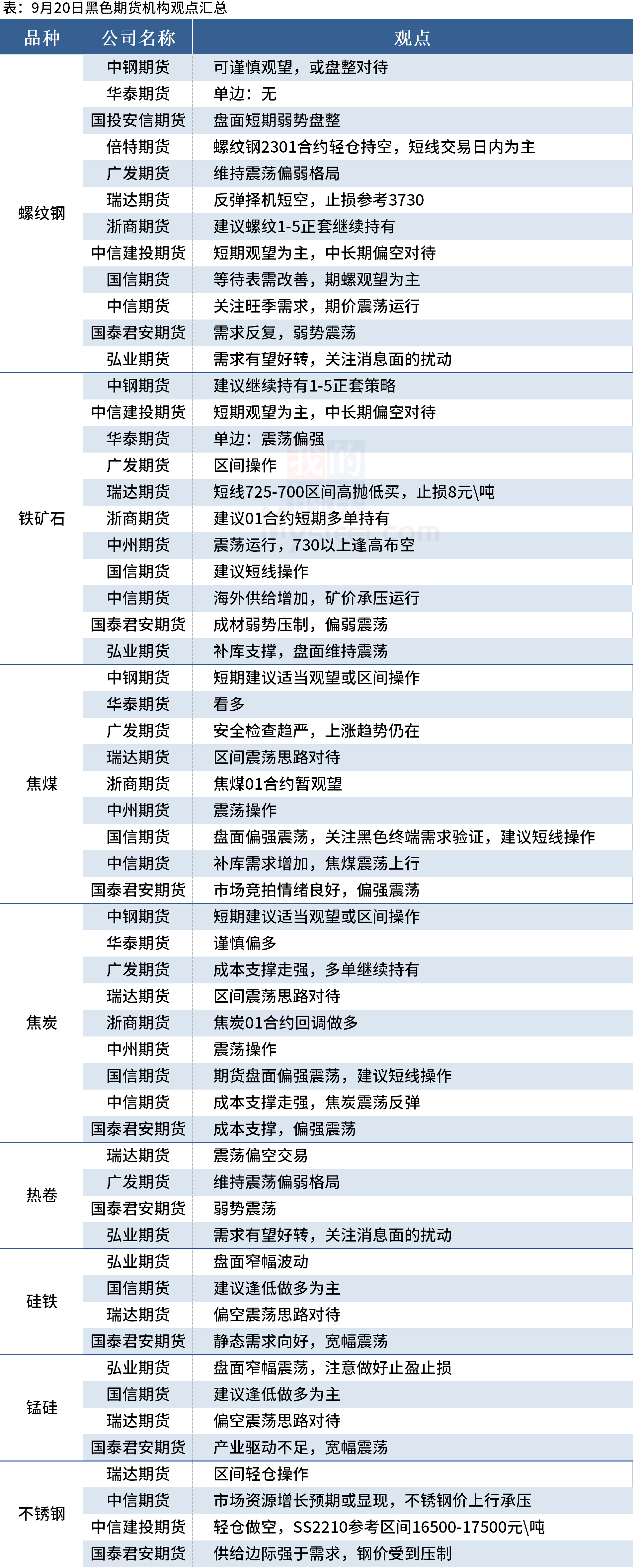 据Mysteel统计9月20日12家期货机构操作策略,其中多数机构料螺纹钢震荡偏弱,建议铁矿石盘面维持震荡,焦煤、焦炭震荡运行。具体汇总内容如下: