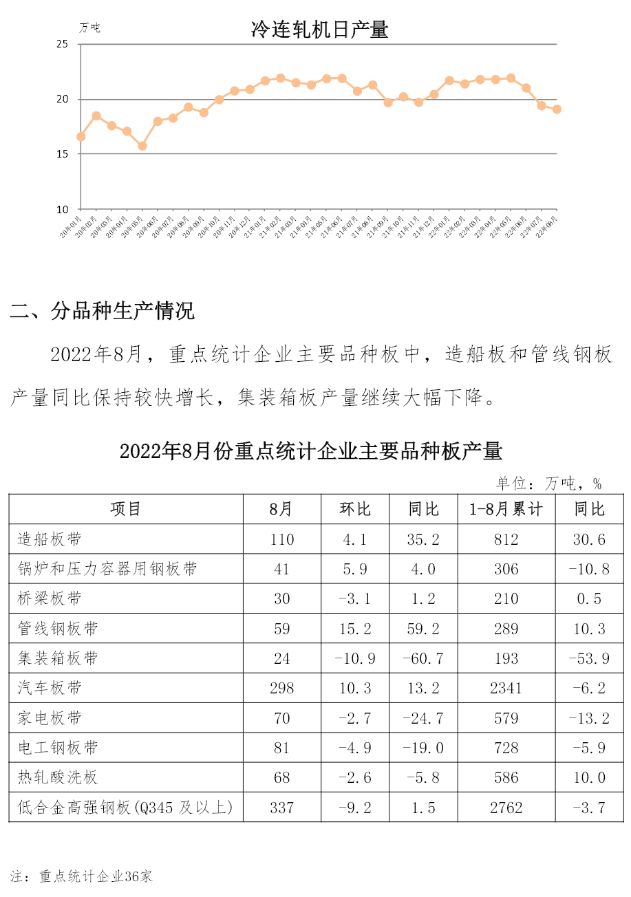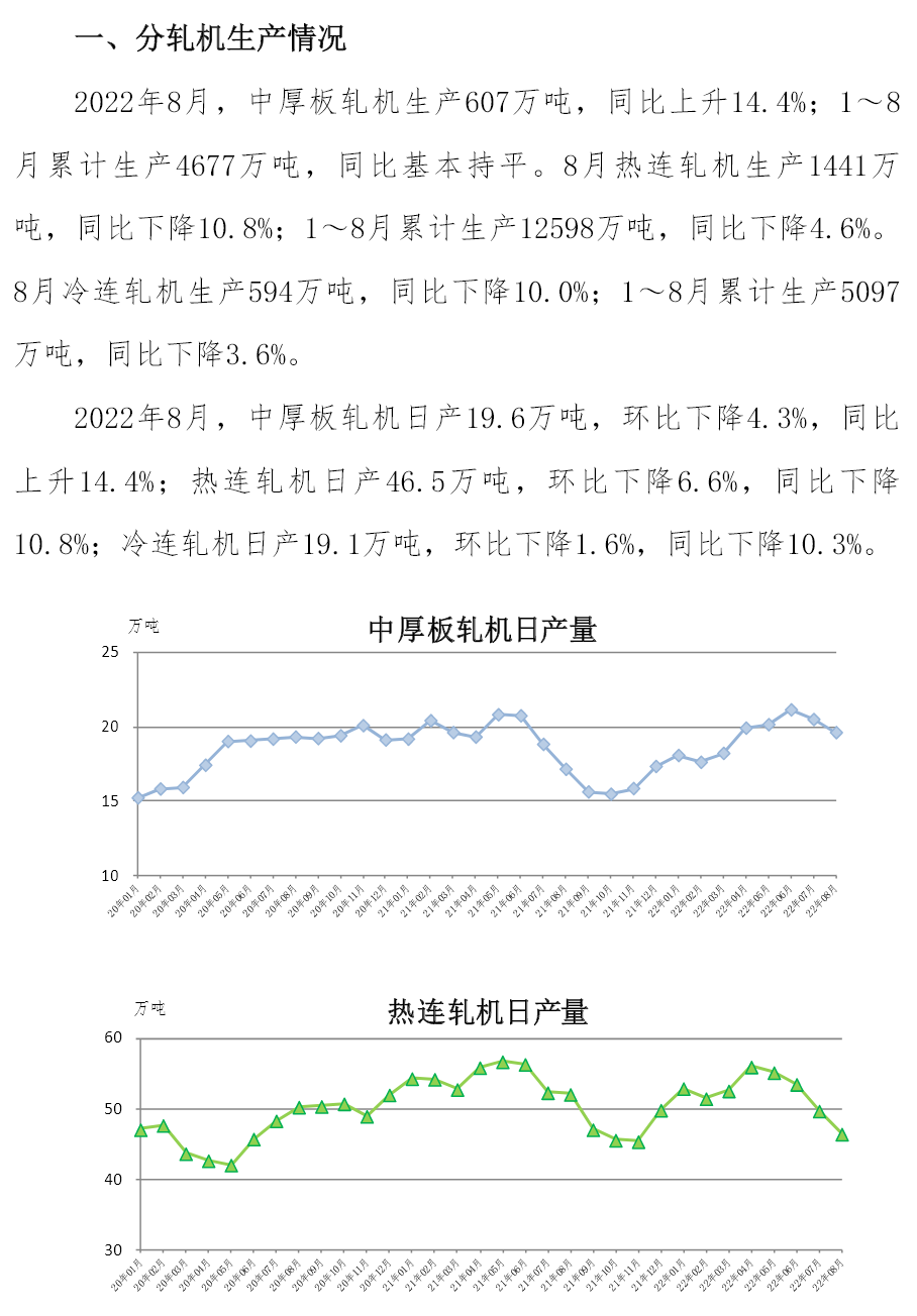 2022年8月,中厚板轧机生产607万吨,同比上升14.4%;1~8月累计生产4677万吨,同比基本持平。8月热连轧机生产1441万吨,同比下降10.8%;1~8月累计生产12598万吨,同比下降4.6%。8月冷连轧机生产594万吨,同比下降10.0%;1~8月累计生产5097万吨,同比下降3.6%。