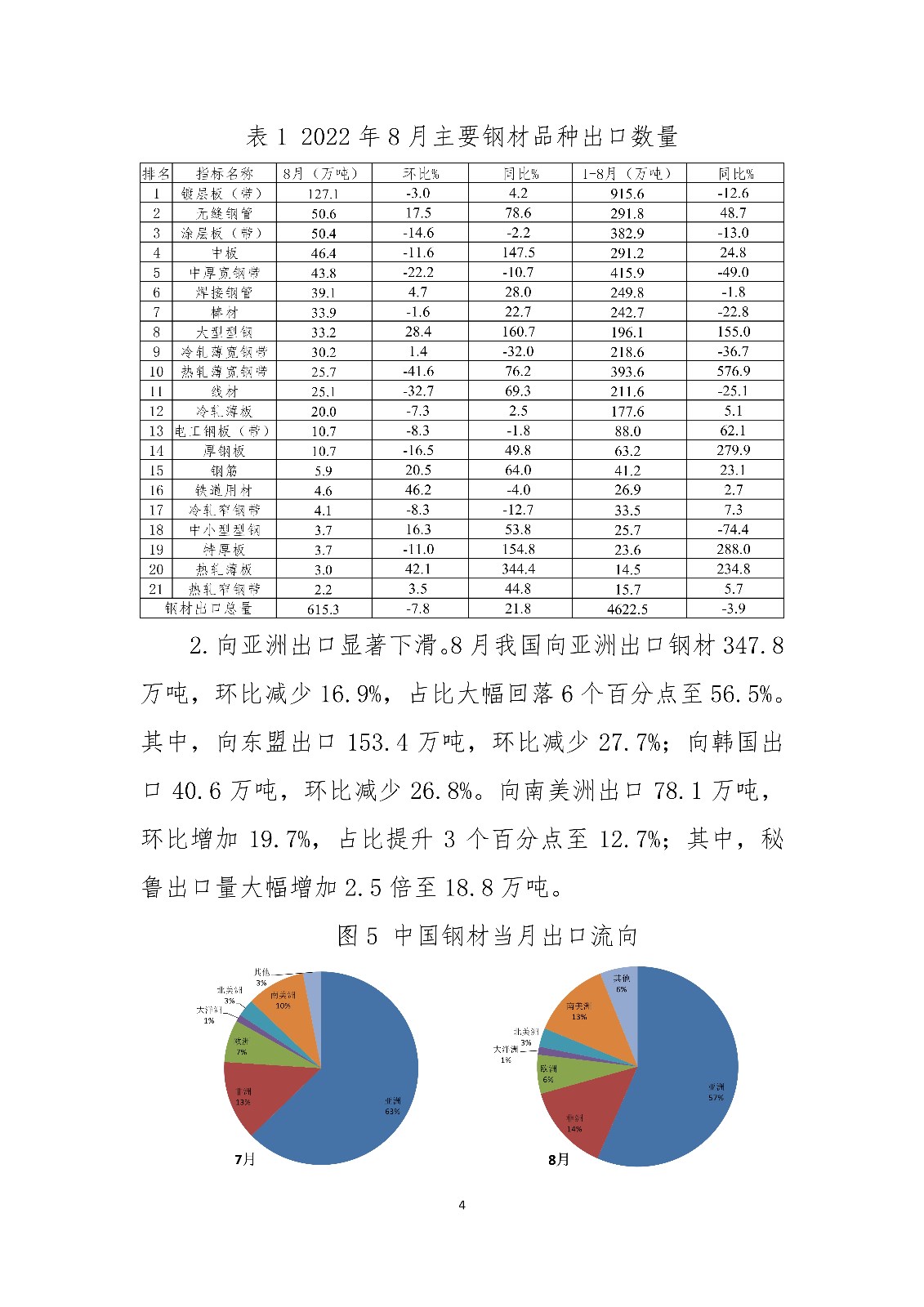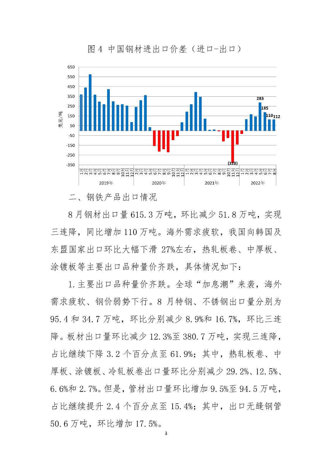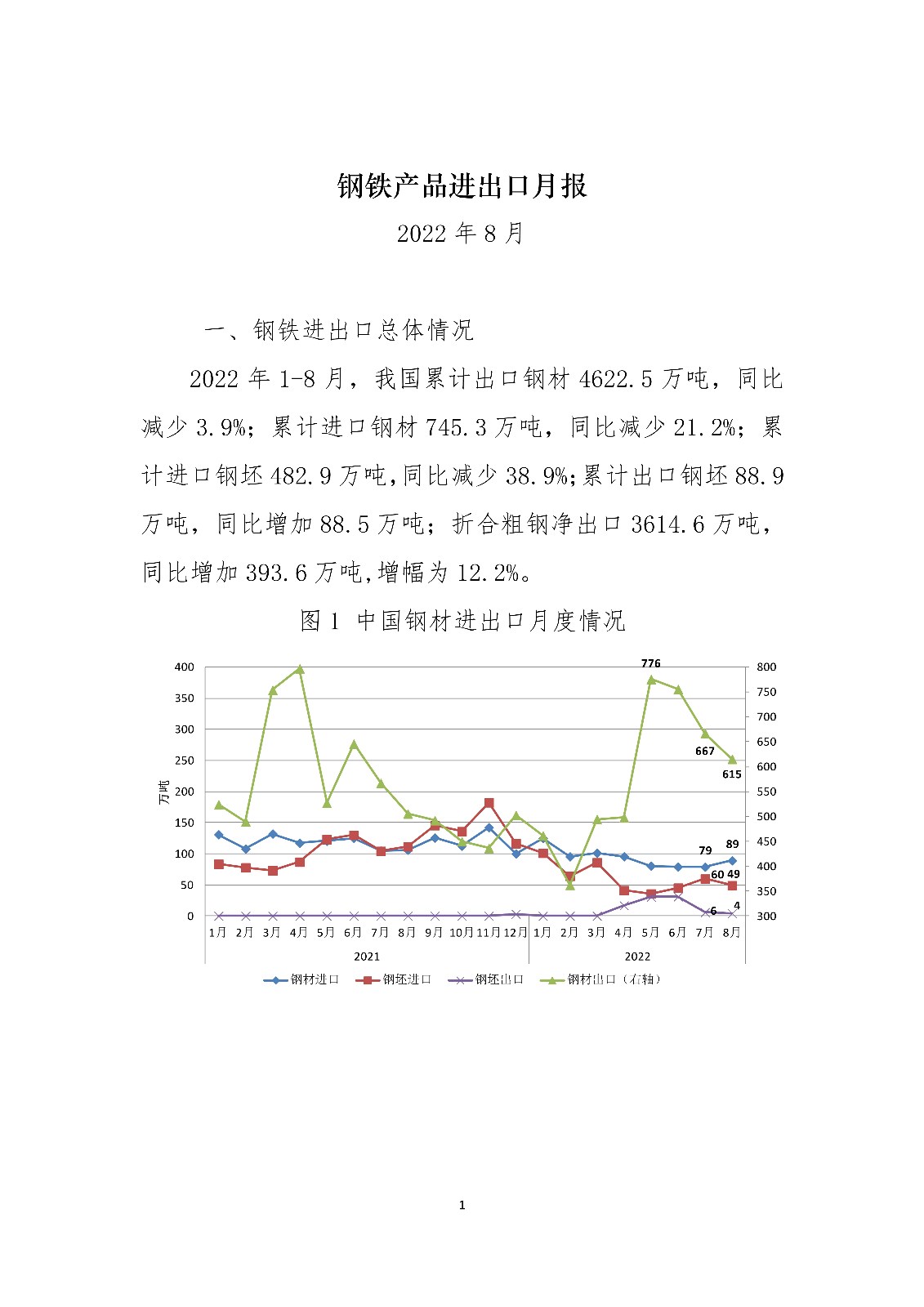 2022年1-8月,我国累计出口钢材4622.5万吨,同比减少3.9%。