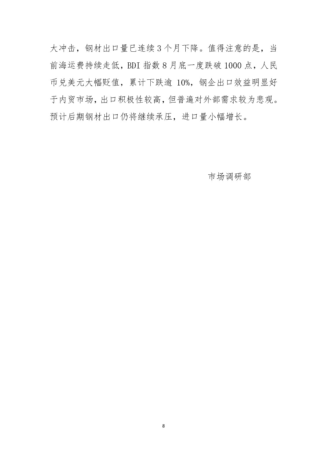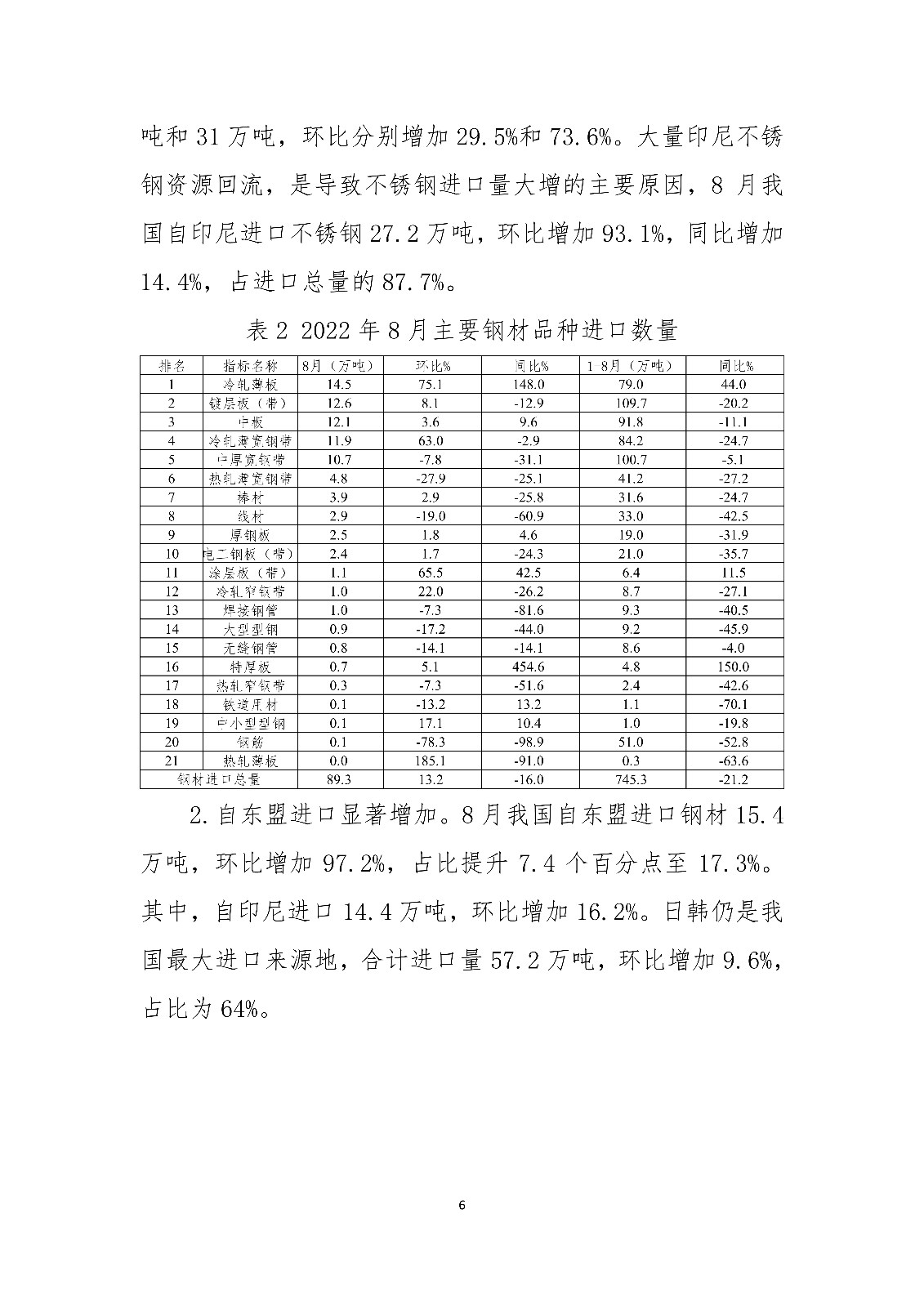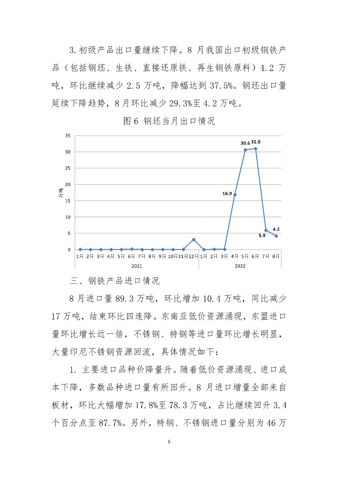 2022年1-8月,我国累计出口钢材4622.5万吨,同比减少3.9%。