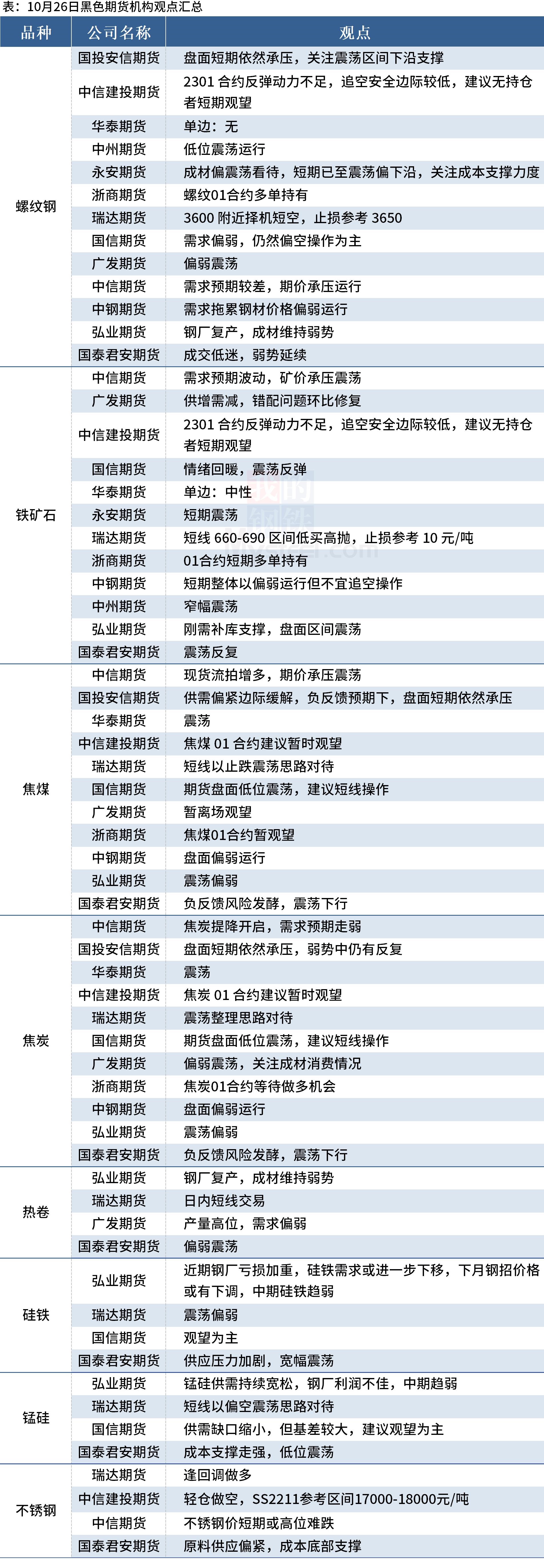 据Mysteel统计10月26日13家期货机构操作策略,其中多数机构料螺纹钢震荡运行,料铁矿石震荡运行,焦煤、焦炭震荡运行。具体汇总内容如下: