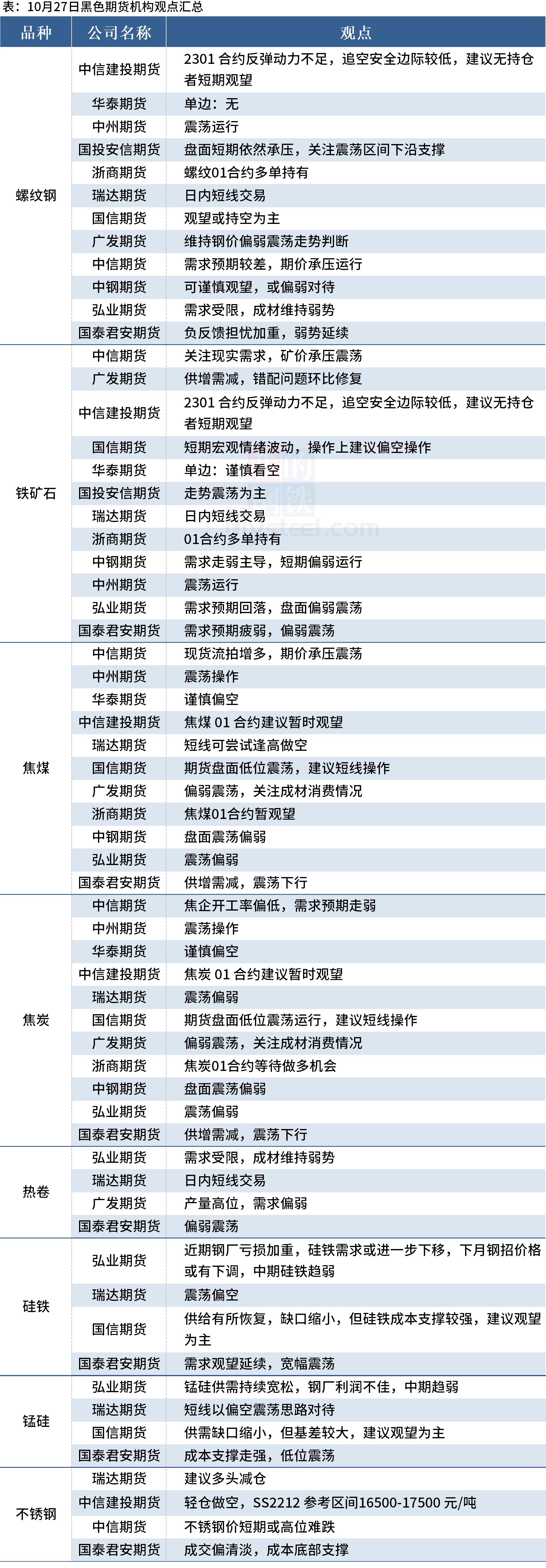 据Mysteel统计10月27日12家期货机构操作策略,其中多数机构料螺纹钢震荡偏弱,料铁矿石震荡运行,焦煤、焦炭震荡偏弱。具体汇总内容如下:
