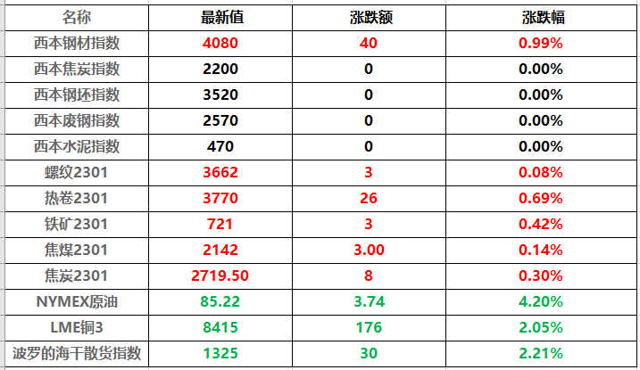 螺纹期货夜盘收涨0.08%,热卷收涨0.69%;铁矿石期货收涨0.42%。焦炭夜盘收涨0.30%,焦煤收涨0.14。橡胶夜盘收涨0.19%,沥青收跌2.34%。豆粕夜盘收跌1.03%,菜粕收跌1.51%。郑棉夜盘收跌1.13%。棕榈油收跌2.20%,尿素收跌2.10%。沪铜夜盘收跌1.26%,沪铝收跌0.42%,沪锌收涨1.53%,沪铅收涨1.54%,沪镍收涨1.59%,沪锡收涨0.97% 。不锈钢夜盘收跌0.80%。