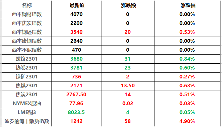 据商务部市场运行监测系统显示,上周(11月14日至20日)全国钢材价格小幅上涨,其中螺纹钢、高速线材、热轧带钢每吨4084元、4312元和4175元,均上涨0.8%。煤炭价格稳中略降,其中炼焦煤每吨1481元,与前一周持平,动力煤、二号无烟块煤每吨968元和1585元,分别下降0.2%和0.1%。