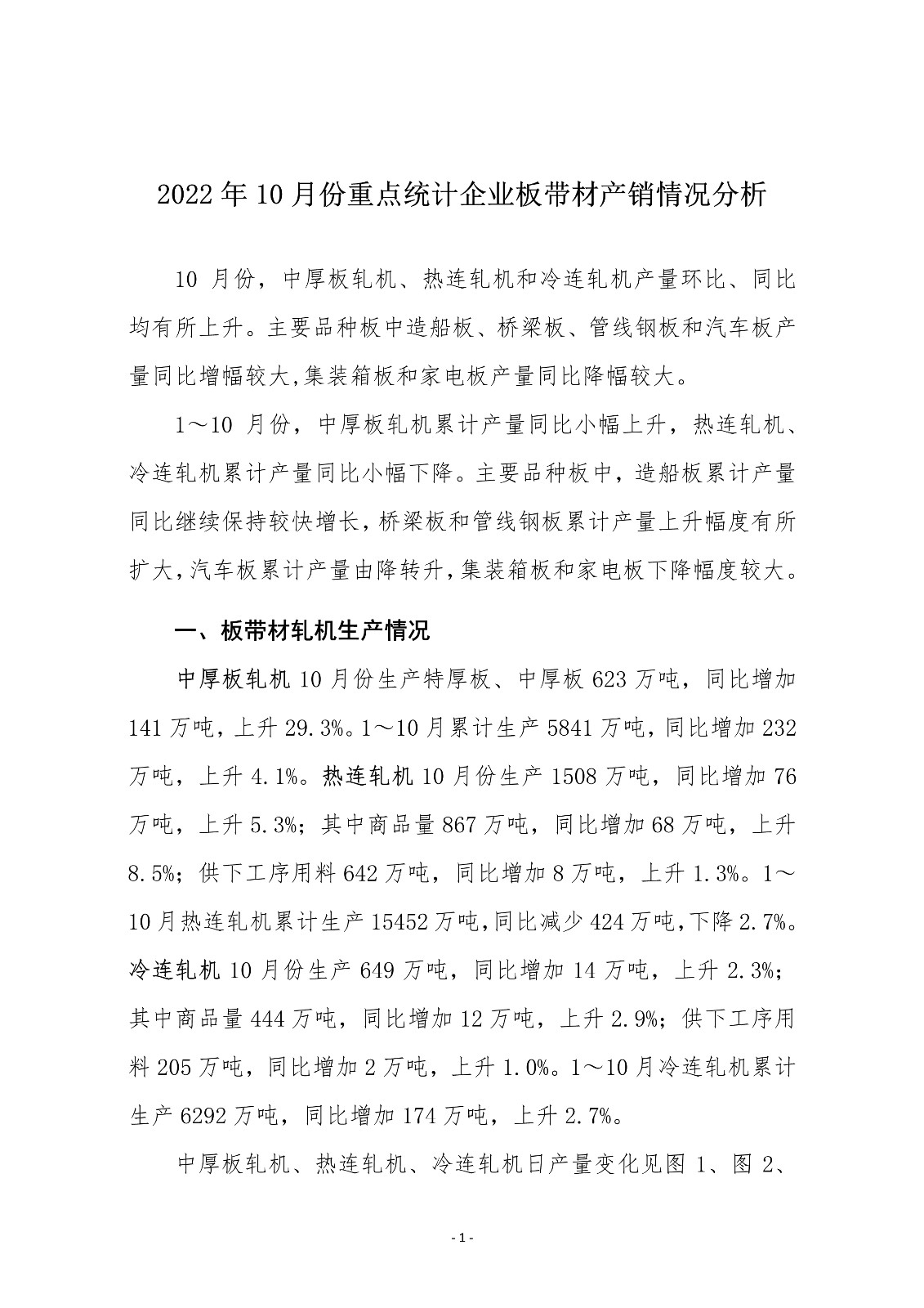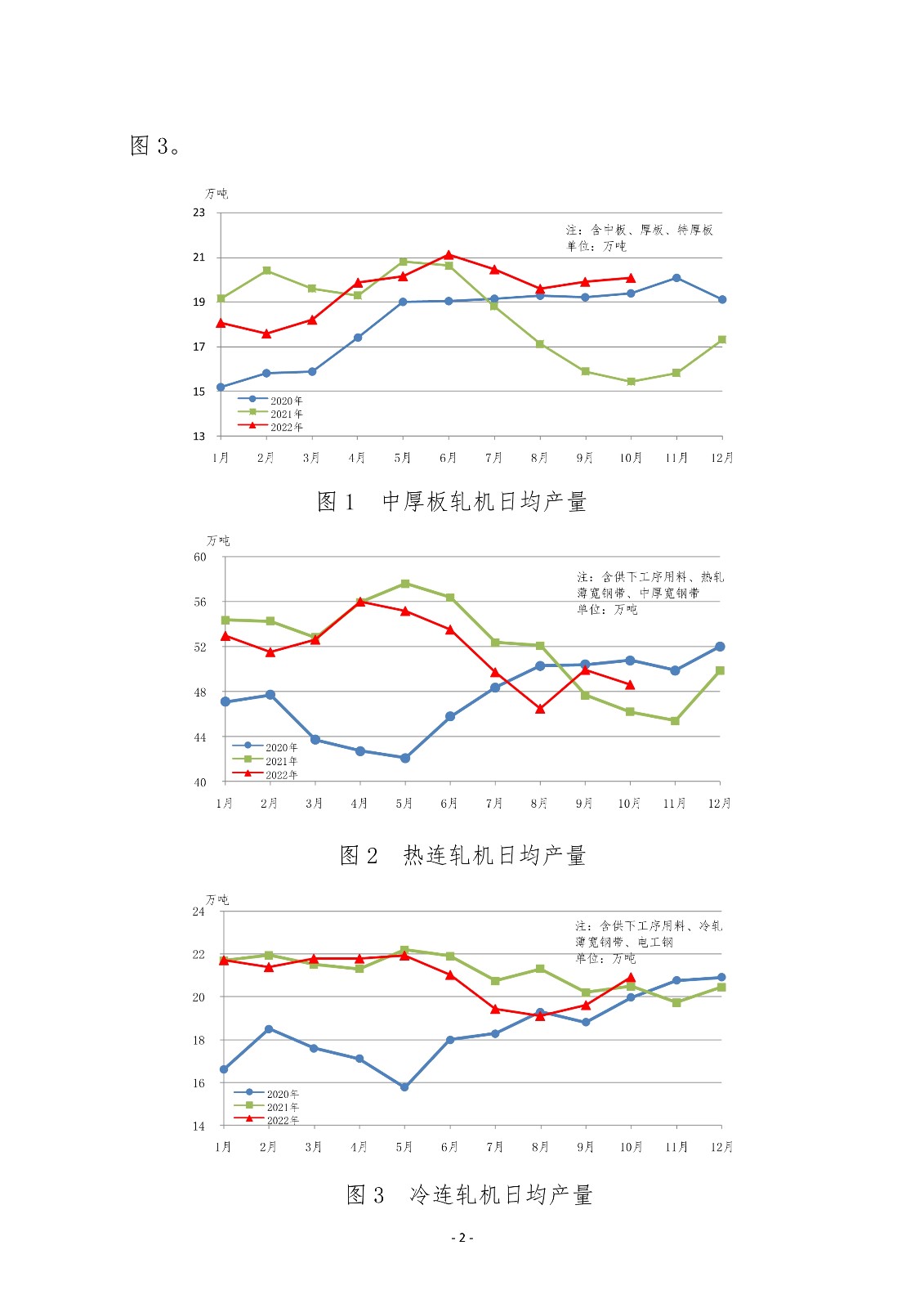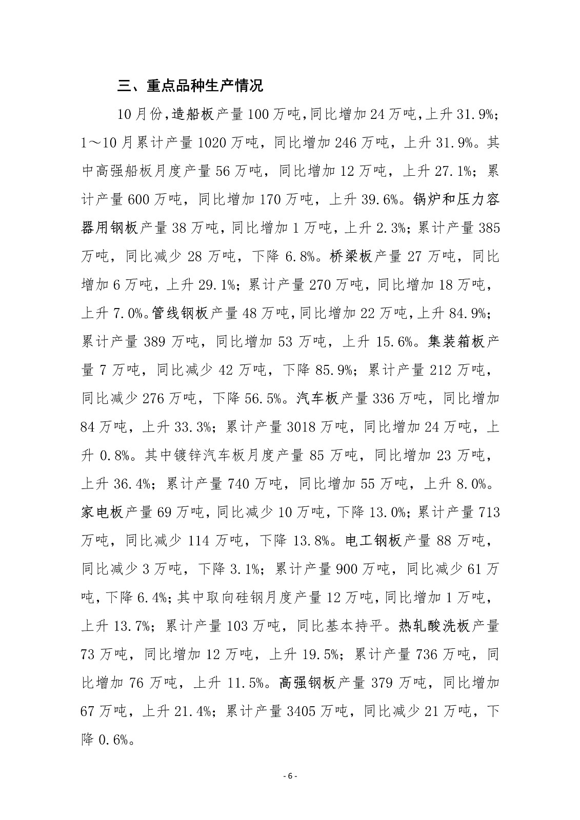 10月份,中厚板轧机、热连轧机和冷连轧机产量环比、同比均有所上升。主要品种板中造船板、桥梁板、管线钢板和汽车板产量同比增幅较大,集装箱板和家电板产量同比降幅较大。