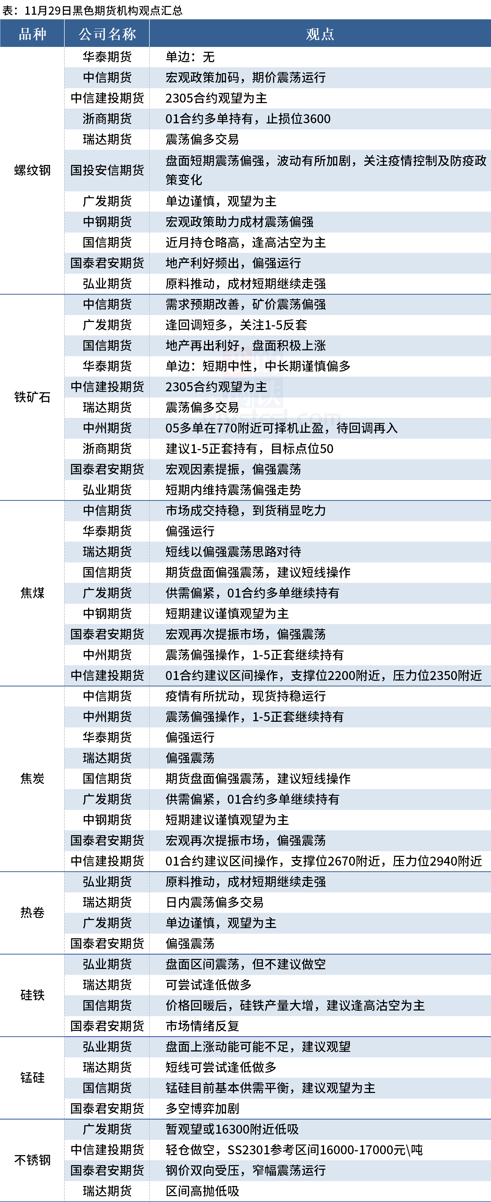 Mysteel统计11月29日12家期货机构操作策略,其中多数机构建议螺纹钢震荡偏强,建议铁矿石震荡偏强,焦煤、焦炭震荡偏强。具体汇总内容如下: