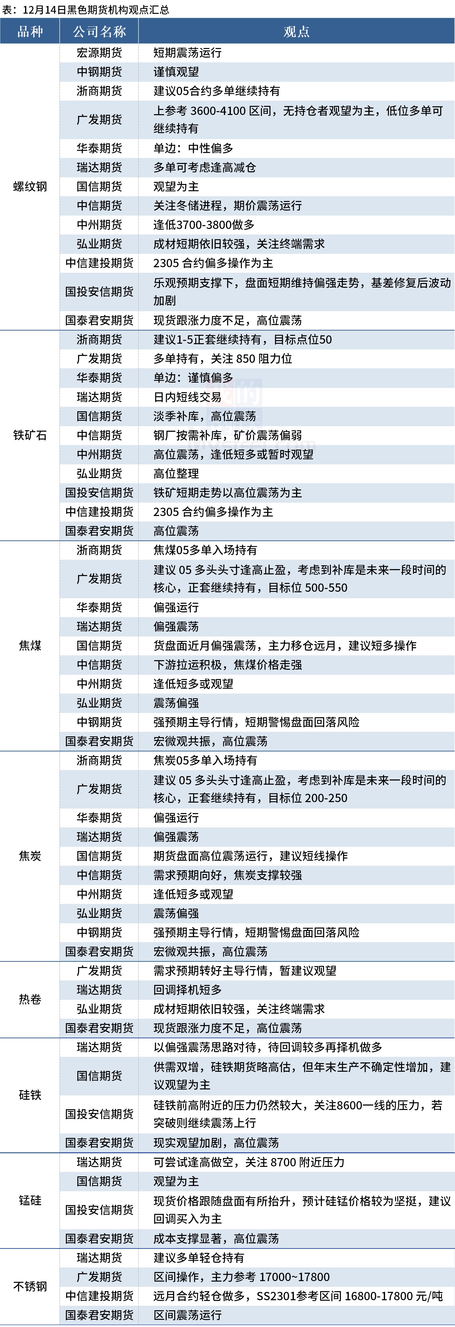 据Mysteel统计12月14日13家期货机构操作策略,其中多数机构看多螺纹钢,建议铁矿石震荡运行,焦煤、焦炭震荡运行。具体汇总内容如下: