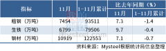 11月,中国粗钢产量7454万吨,同比增长7.3%;生铁产量6799万吨,同比增长9.7%;钢材产量10919万吨,同比增7.1%。