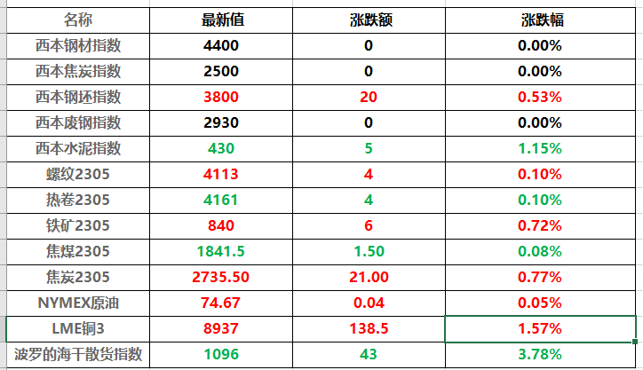 乙二醇涨超2%,菜粕、铁矿石等小幅上涨;淀粉、玻璃等小幅下跌。上期所原油期货2303合约夜盘收跌0.61%,报524.40元人民币/桶。沪金夜盘收涨0.15%,沪银收跌0.48%。国际铜夜盘收涨1.41%,沪铜收涨1.20%,沪铝收涨0.63%,沪锌收跌0.15%,沪铅收跌0.87%,沪镍收跌0.33%,沪锡收涨0.82%。不锈钢夜盘收跌1.44%。