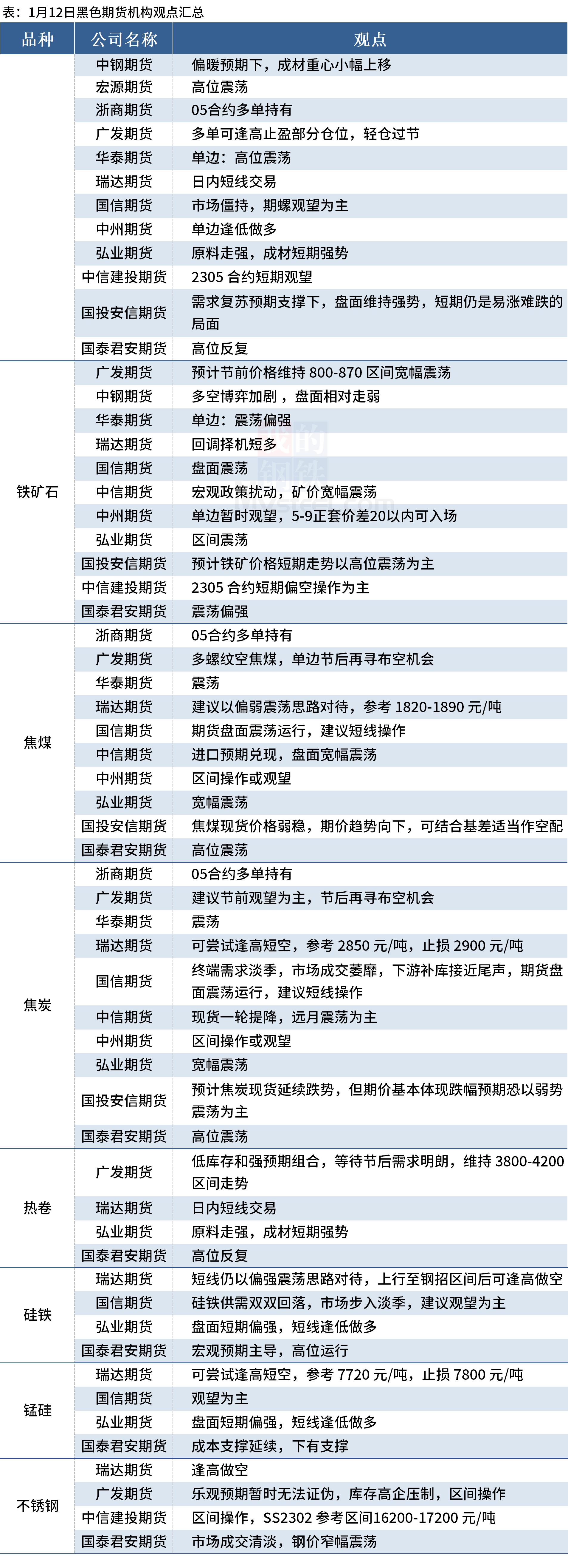 Mysteel统计1月12日13家期货机构操作策略,其中多数机构建议螺纹钢震荡运行,建议铁矿石震荡运行,焦煤、焦炭震荡偏弱。具体汇总内容如下: