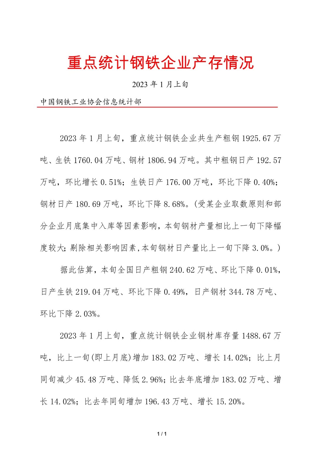 据中钢协数据显示,2023年1月上旬,重点钢企粗钢日均产量192.57万吨,环比增长0.51%;钢材库存量1488.67万吨,比上一旬增加183.02万吨,增长14.02%。