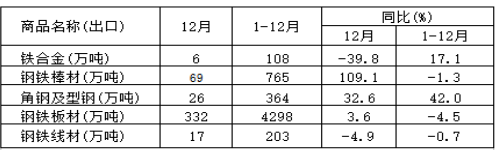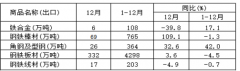 12月,中国出口钢铁棒材69万吨,同比增长109.1%;1-12月累计出口765万吨,同比下降1.3%。