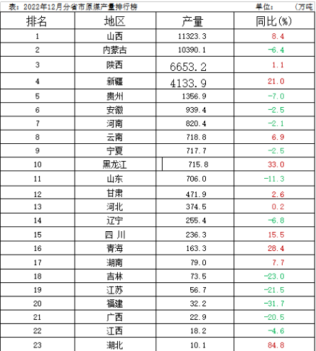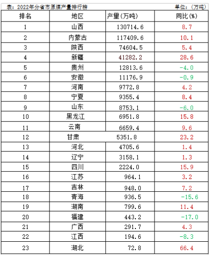 摘要:从分省数据来看,2022年山西、内蒙古、陕西、新疆、贵州5省原煤产量合计为376824.5万吨,占全国总产量的83.8%