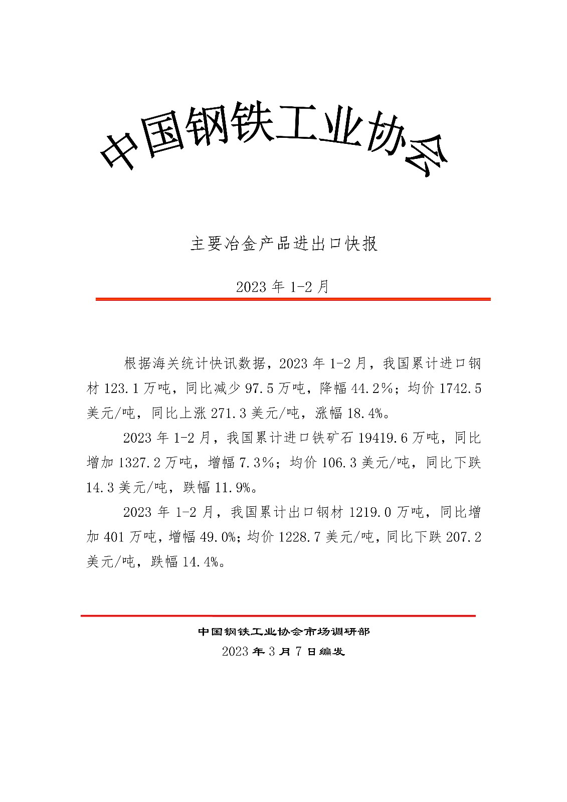 根据海关统计快讯数据,2023 年1-2月,我国累计进口钢材123.1万吨,同比减少97.5万吨,降幅 44.2%;均价1742.5美元/吨,同比上涨 271.3 美元/吨,涨幅 18.4%。