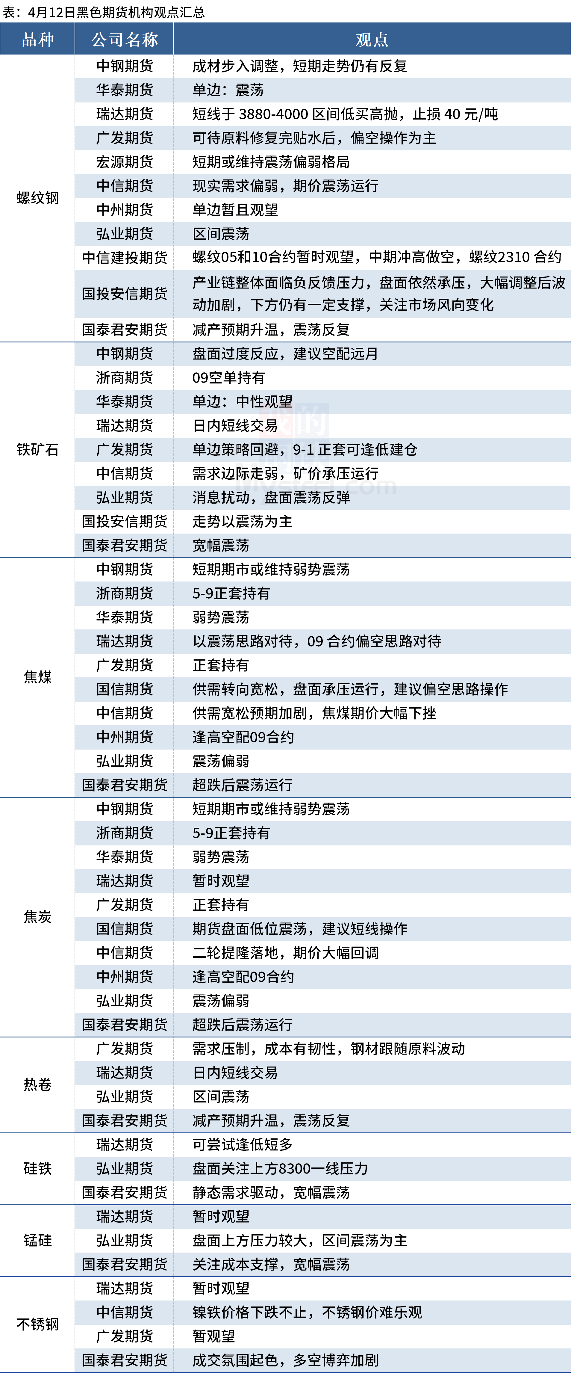 据Mysteel统计4月12日11家期货机构操作策略,其中多数机构建议螺纹钢震荡运行,建议铁矿石震荡运行,焦煤、焦炭震荡偏弱。具体汇总内容如下: