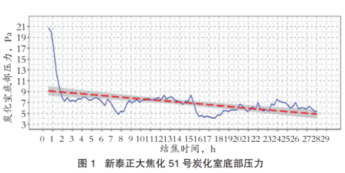 焦炉集气管压力及炭化室底部压力的平稳是焦炉顺行运行的关键。行业内80余座焦炉实现了炭化室压力自动调节,集气管压力保持在一定负压的范围内,炭化室底部压力始终在5Pa左右。山东新泰正大焦化6.78m捣固焦炉的51号炭化室,单个周期内压力波动曲线,如图1所示。可以看出,其炭化室底部压力在结焦过程的绝大多数时间内能维持在+5~+30Pa之间,其控制效果良好。