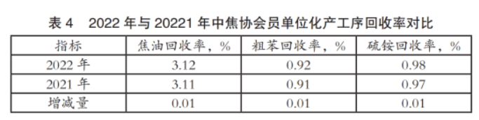 2022年会员单位煤气净化工序的焦油、粗苯、硫铵3大产品回收率同比均提高了0.01个百分点,如表4所示。