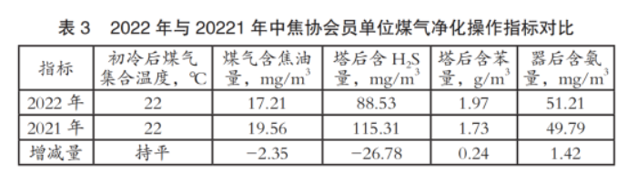 2022年会员单位煤气净化脱硫塔后H2S含量改善比较明显,从2021年的115.31mg/m3降低到2022年的88.53mg/m3,降低了26.78mg/m3,降幅达23%,如表3所示。