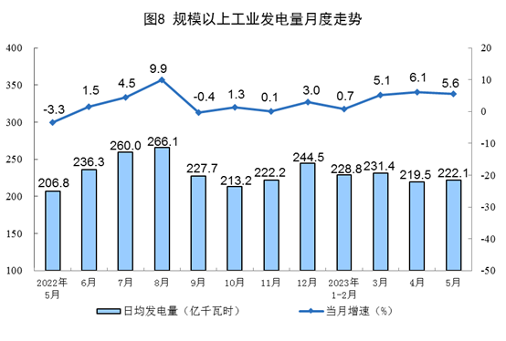 电力生产增速略有回落。5月份,发电6886亿千瓦时,同比增长5.6%,增速比4月份回落0.5个百分点,日均发电222.1亿千瓦时。1—5月份,发电34216亿千瓦时,同比增长3.9%。