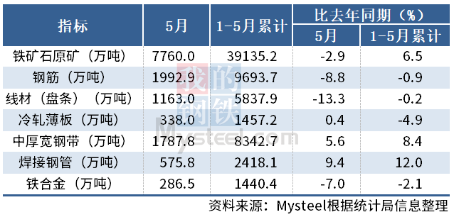 5月份,中国铁矿石原矿产量为7760.0万吨,同比下降2.9%;1-5月累计产量为39135.2万吨,同比增长6.5%。