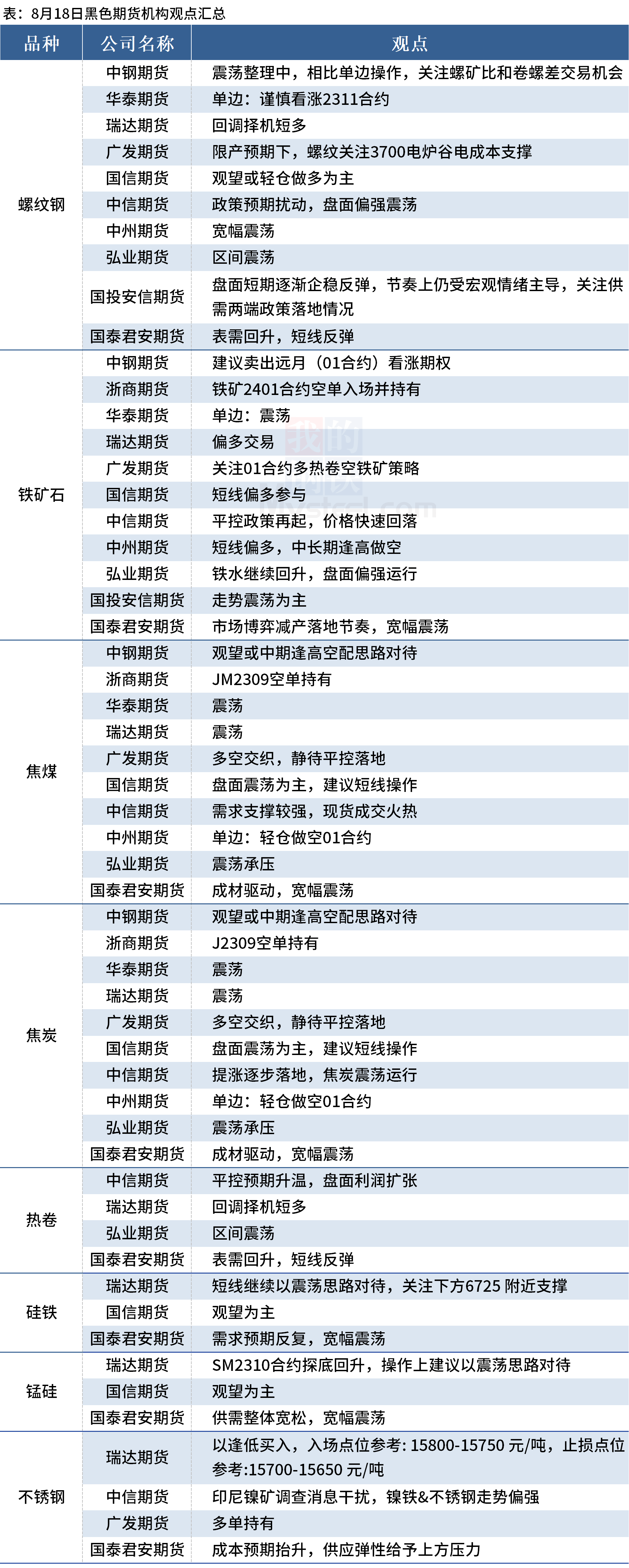 Mysteel统计8月18日10家期货机构操作策略,其中多数机构预估螺纹钢、铁矿石、焦煤、焦炭震荡运行。具体汇总内容如下: