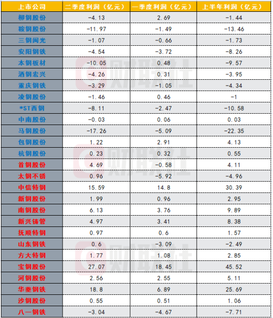 在成本、需求两端压力下,国内钢铁企业中期业绩普遍承压,长短流程冶炼钢企业绩几乎全部同比下降,其中半数上市钢企亏损。