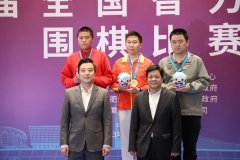体育总局棋牌运动管理中心主任、中国围棋协会副主席兼秘书长朱国平(右)、中国围棋协会副主席古(左)为业余男子个人赛前三名颁奖,杨楚焜在二排左一