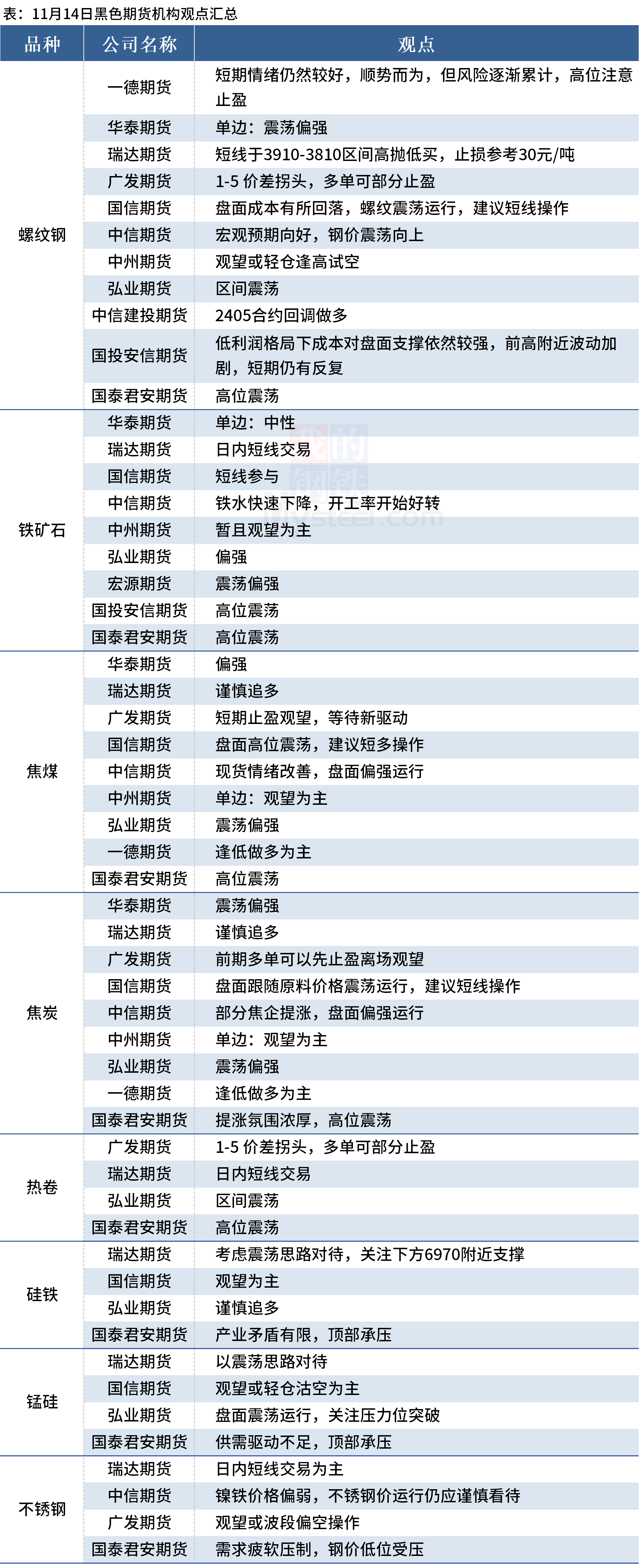 据Mysteel统计11月14日11家期货机构操作策略,其中多数机构料螺纹钢震荡运行,铁矿石震荡运行,焦煤、焦炭震荡偏强。具体汇总内容如下: