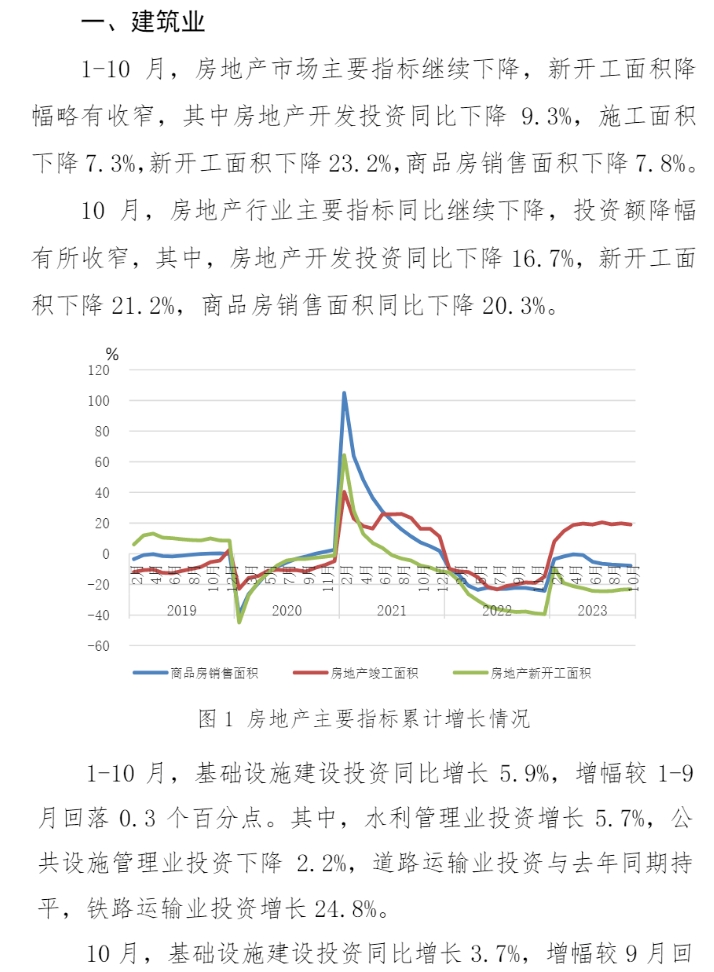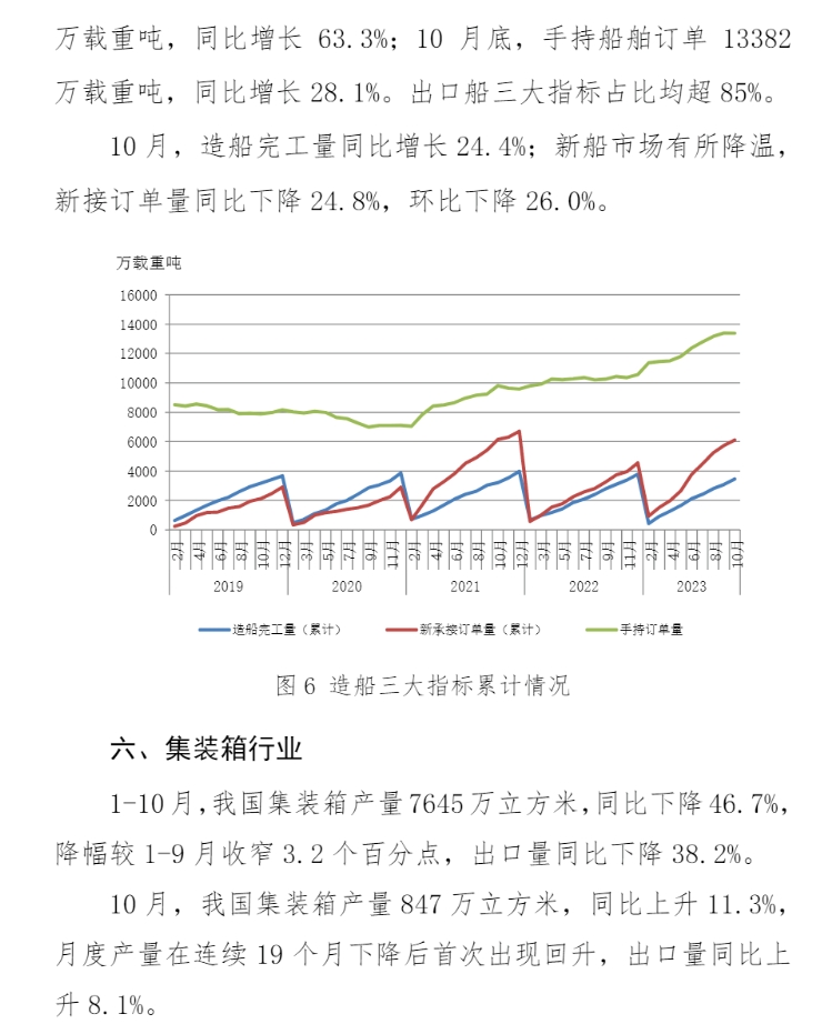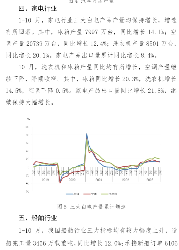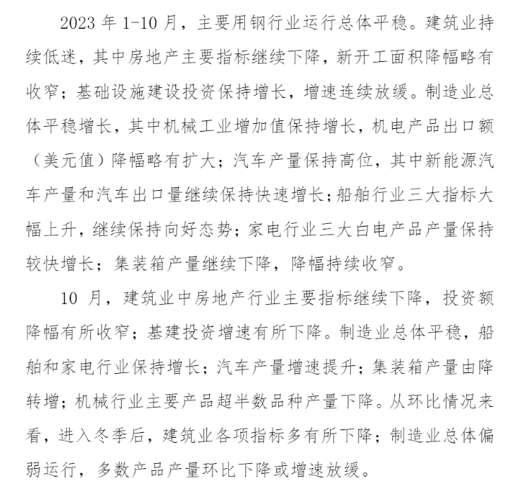 2023年1-10月,主要用钢行业运行总体平稳。建筑业持续低迷,其中房地产主要指标继续下降,新开工面积降幅略有收窄:基础设施建设投资保持增长,增速连续放缓。制造业总体平稳增长,其中机械工业增加值保持增长,机电产品出口额(美元值)降幅略有扩大;汽车产量保持高位,其中新能源汽车产量和汽车出口量继续保持快速增长;船舶行业三大指标大幅上升,继续保持向好态势;家电行业三大白电产品产量保持较快增长;集装箱产量继续下降,降幅持续收窄。