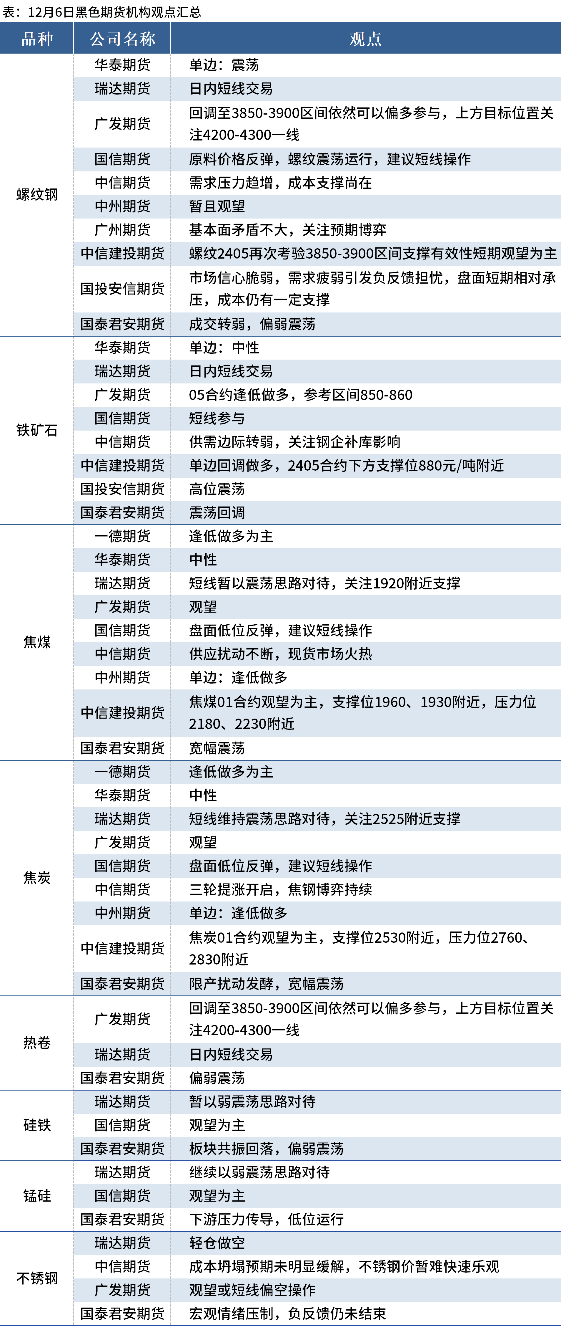 据Mysteel统计12月6日10家期货机构操作策略,其中多数机构料螺纹钢震荡运行,铁矿石震荡运行,焦煤、焦炭震荡运行。具体汇总内容如下: