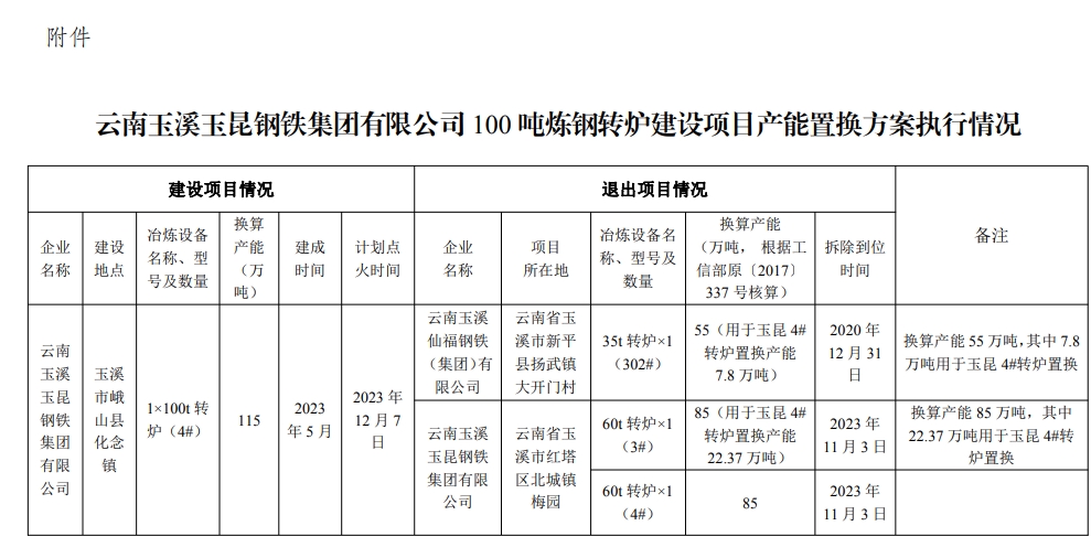附件:云南玉溪玉昆钢铁集团有限公司100吨炼钢转炉建设项目产能置换方案执行情况