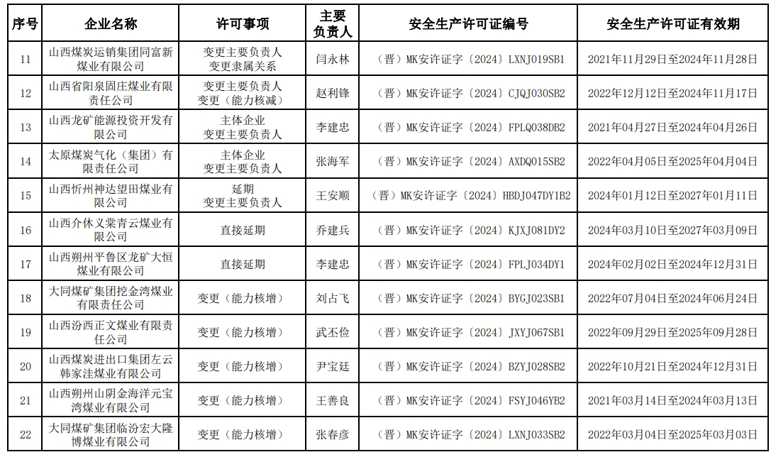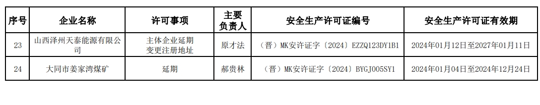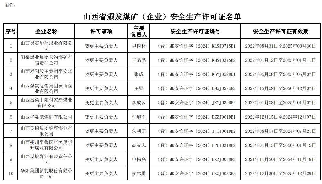经研究,按照有关规定,为山西灵石华苑煤业有限公司等 24 座煤矿(企业)颁发安全生产许可证,现进行公告。