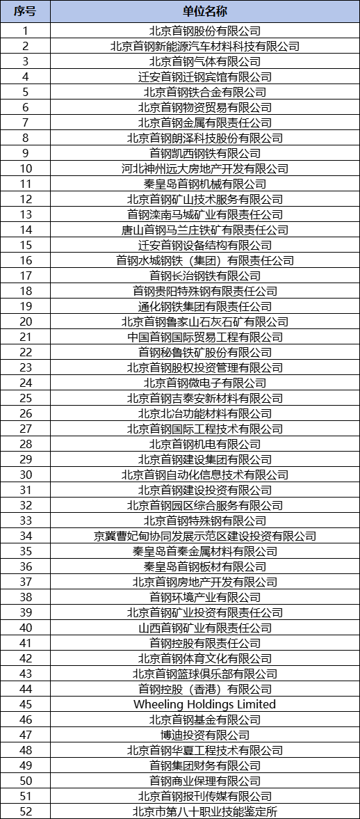 近期,首钢集团官网发布了旗下52家企业名单。具体内容如下: